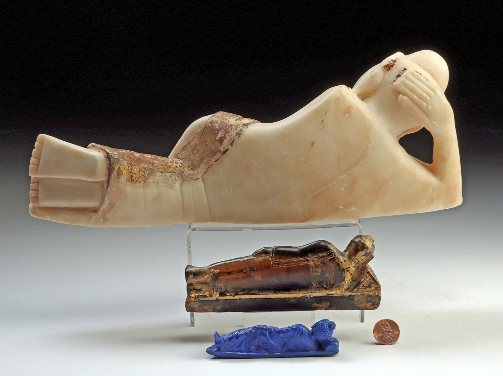 Lot 189a, Auction 4/3/2026: Burmese Reclining Buddhas – Marble, Glass, Lapis Lazuli