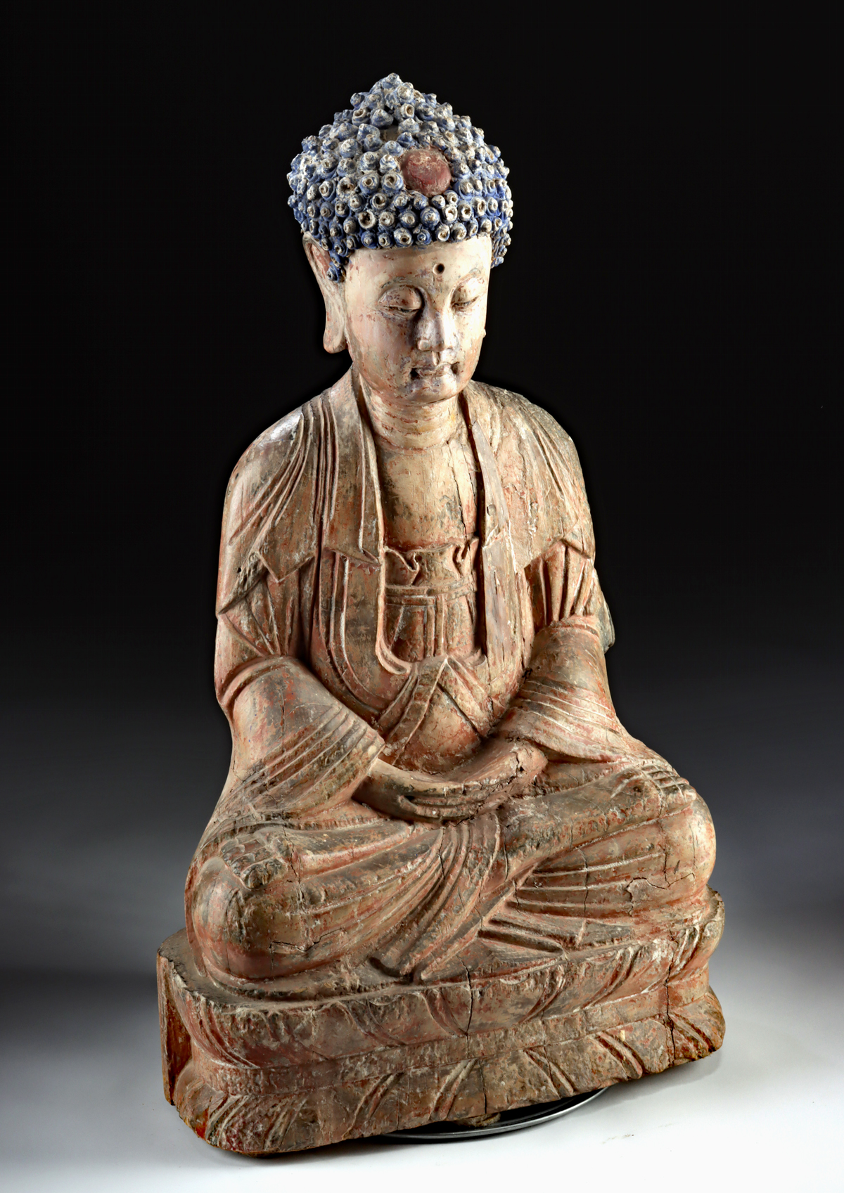 East Asia, China, Ming Dynasty, ca. 1368 to 1644 CE. A large wooden Buddha statue, sculpted with plaster or stucco, featuring tightly coiled curls. The figure is seated on a lotus pedestal in the dhyanasana position, with hands folded in the lap, forming the dhyana mudra of meditation. The plaster hair is arranged in tight coils, shaped like snail shells, with the characteristic blue pigment, and a red ushnisha at the front. On the verso, a square cut is visible, which may have served as a niche for consecrating offerings or, alternatively, could have had a technical purpose, such as securing the Buddha to a niche like a tenon socket. Size: 16″ L x 10″ W x 31″ H (40.6 cm x 25.4 cm x 78.7 cm).