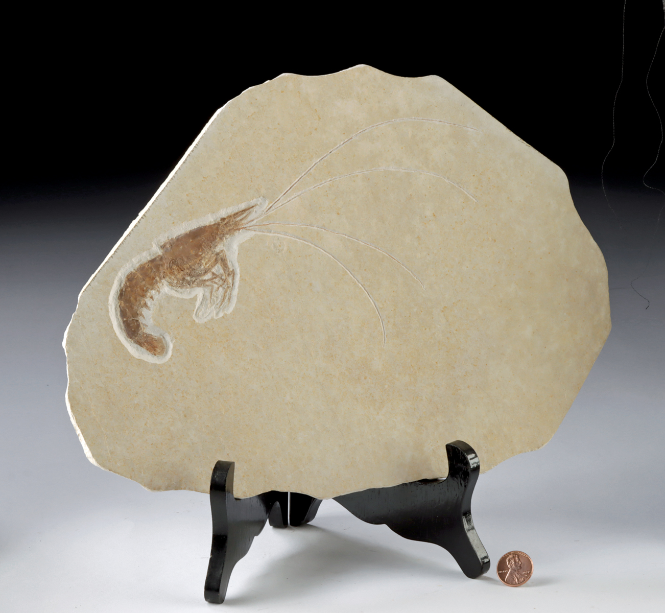 Western Europe, Germany, Eichstatt, Solnhofen (Altmuhltal) Formation, Jurassic Period, ca. 160 million years ago. A shrimp fossil preserved in a large limestone matrix slab displaying excellent articulation! The prawn is probably in the prehistoric Aeger genus; the streamlined body is prepared to be slightly raised above the rest of the surrounding matrix and the orange hues contrast and highlight the exoskeleton. Light touchups to the fine, lengthy antennae and feathery pleopods helps bring to life this prehistoric crustacean! Size of shrimp: 3.3″ W x 3.2″ H (8.4 cm x 8.1 cm); of matrix: 11.6″ W x 8.6″ H (29.5 cm x 21.8 cm); 9.5″ H (24.1 cm) on included custom stand.