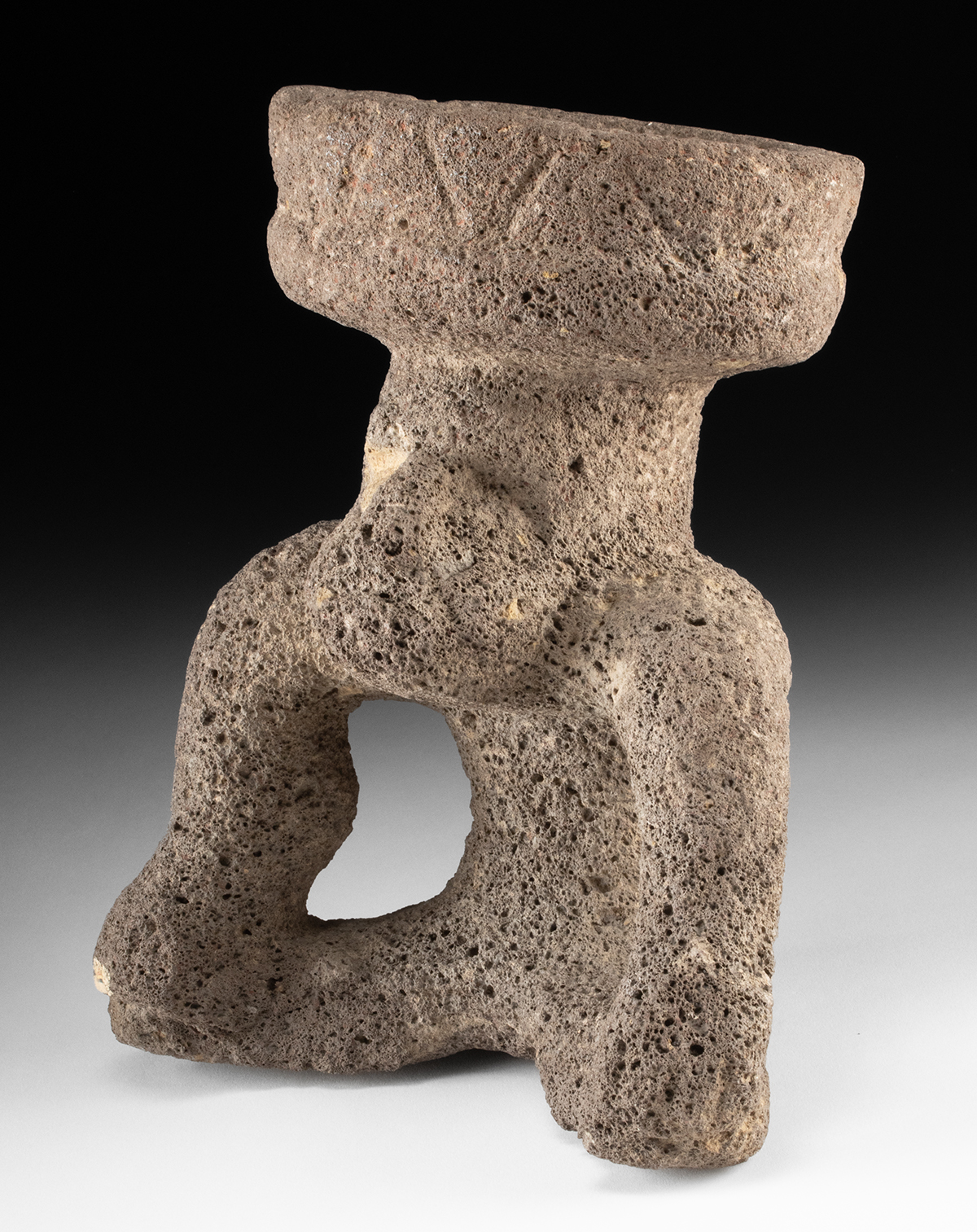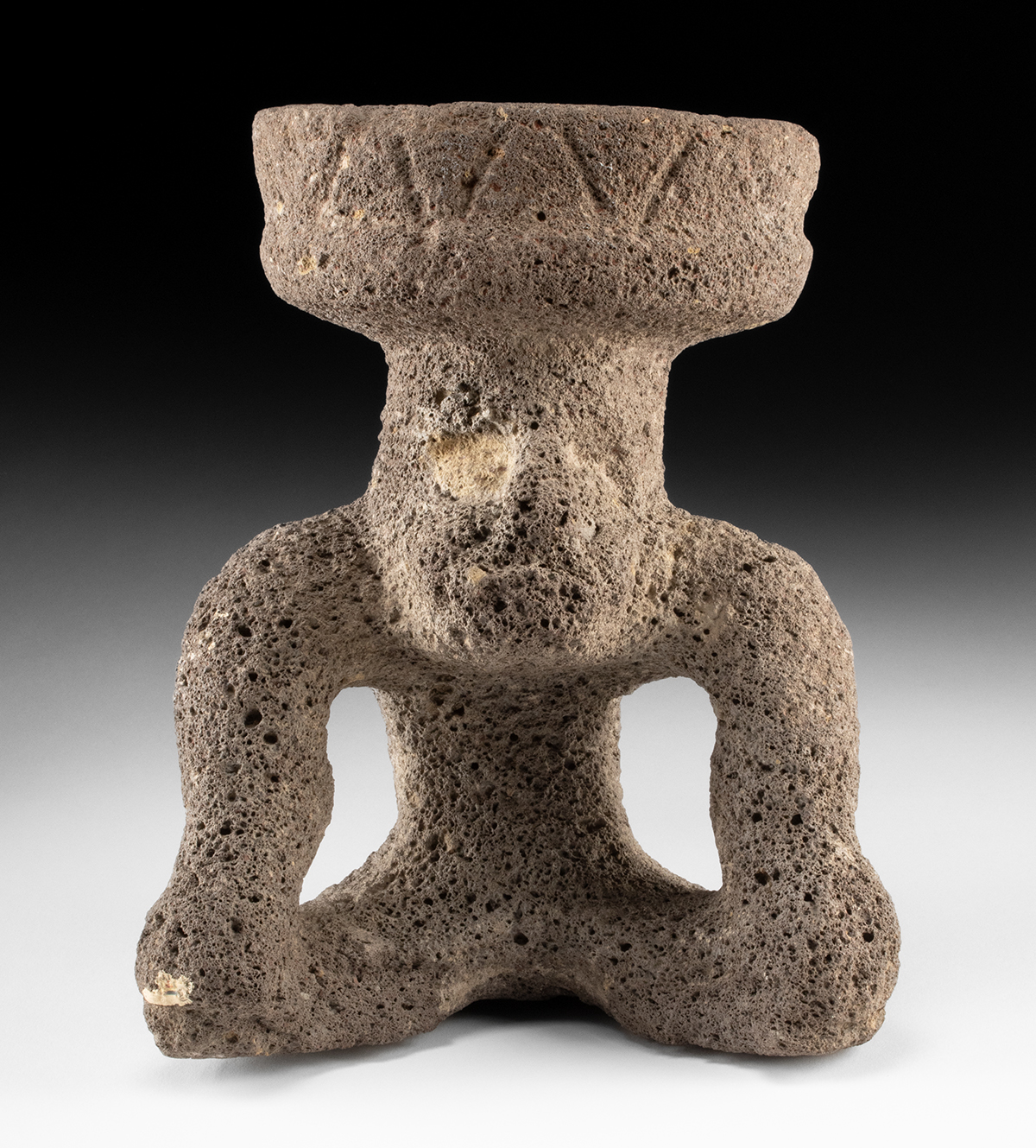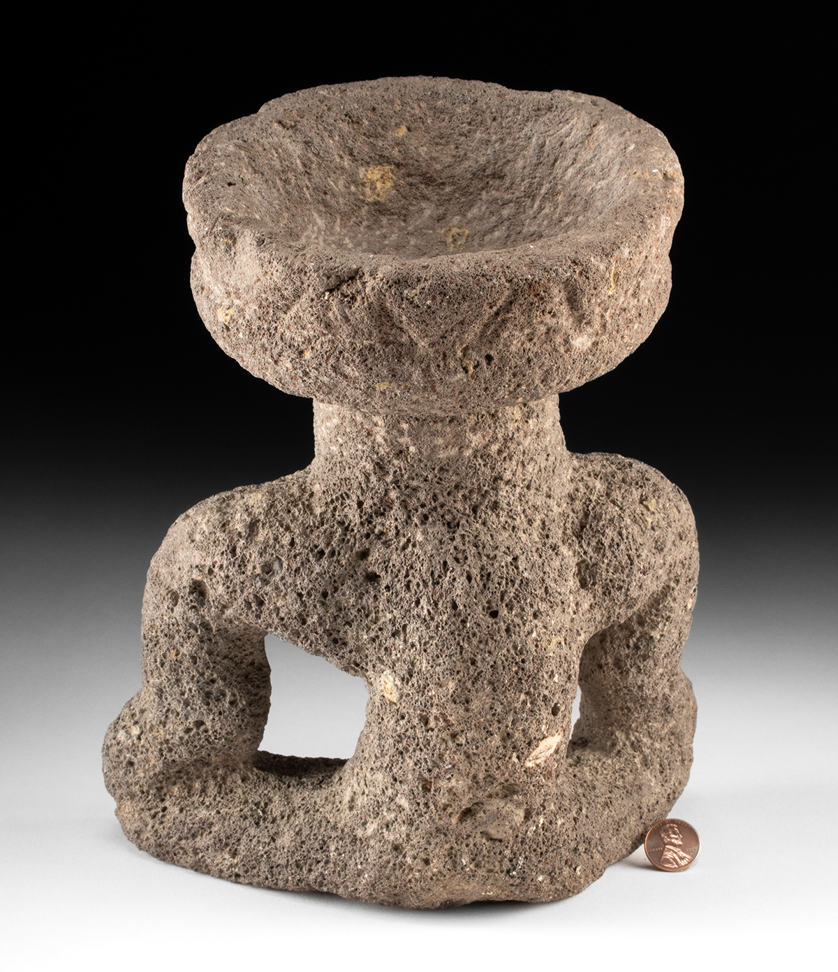Pre-Columbian, Mexico, Aztec, ca. 500 to 1520 CE. A basalt effigy carving in basalt or scoria (volcanic flow rock), of a seated anthropomorphic figure shown in a hunched, forward-facing posture with slightly bulging cheeks and deep-set eyes that stare ahead with a trance-like intensity. The head supports a shallow incensario or ritual bowl, integrating the vessel into the figure’s form and suggesting ceremonial use. Size: 7.25″ W x 10.5″ H (18.4 cm x 26.7 cm)