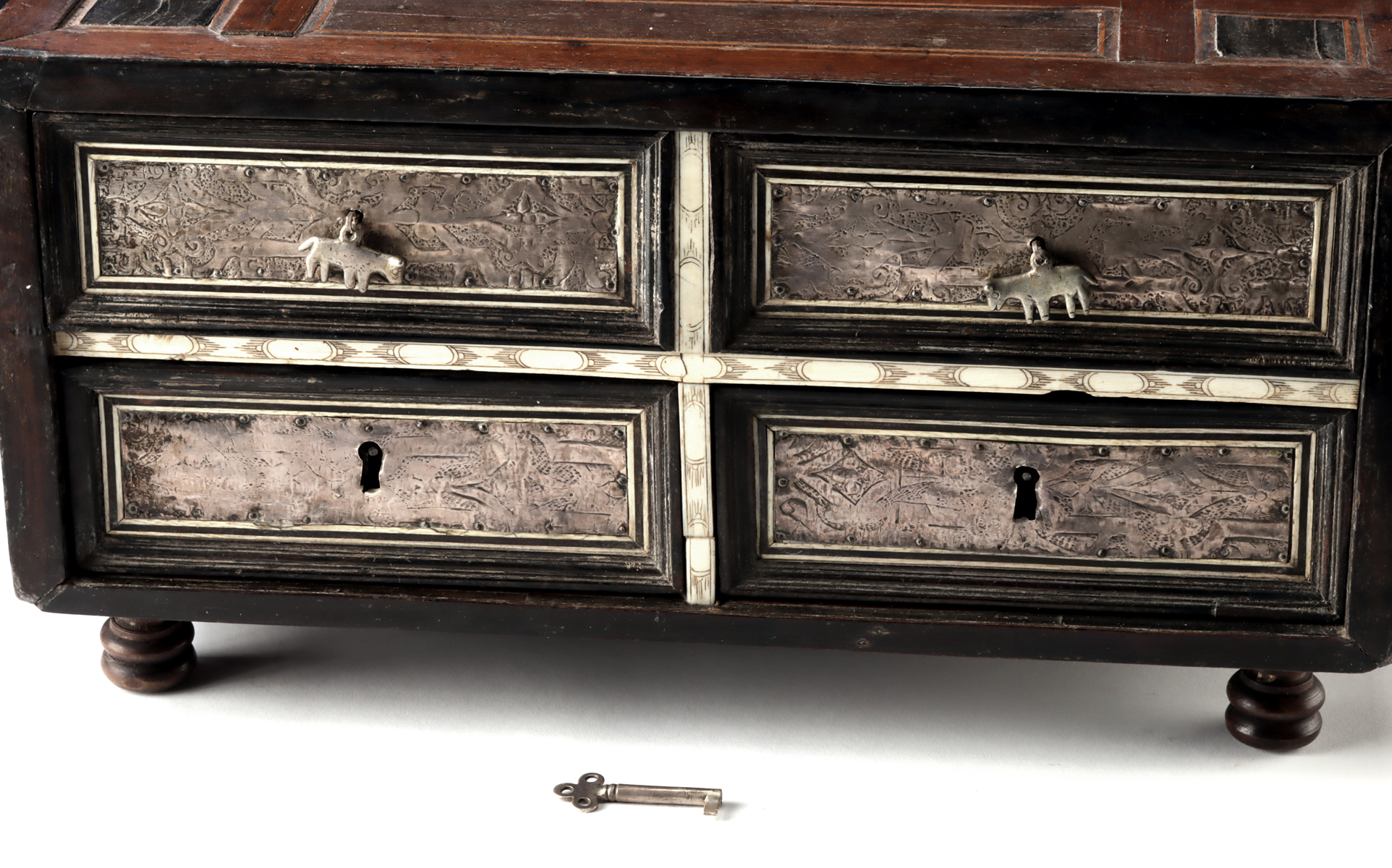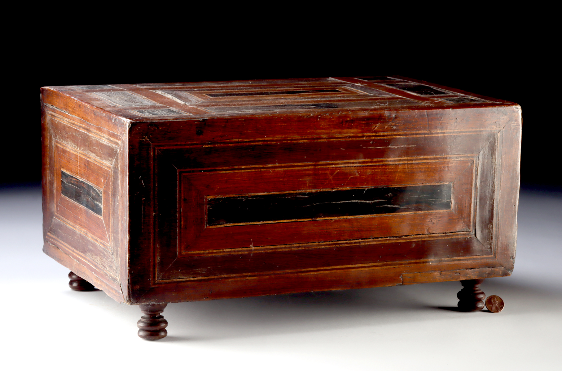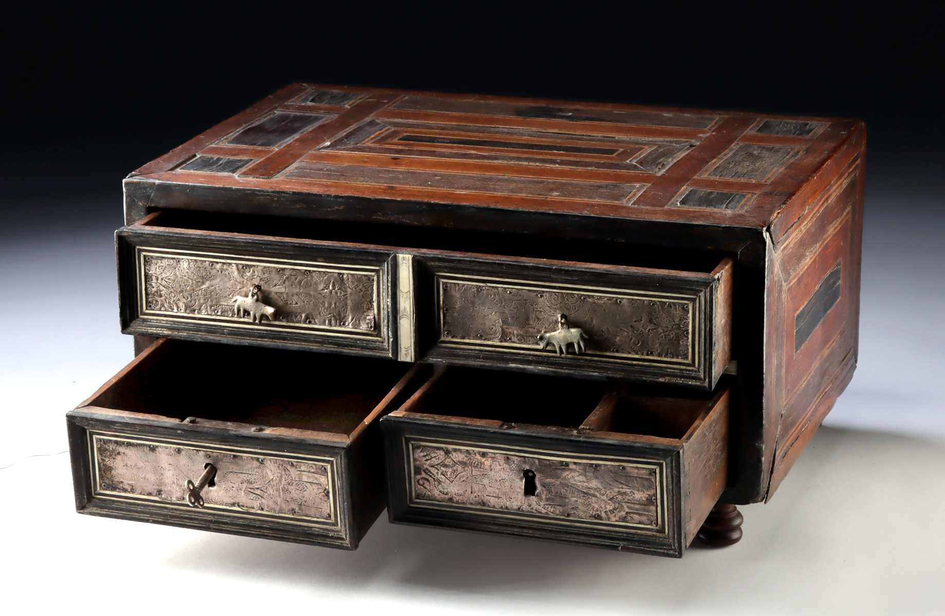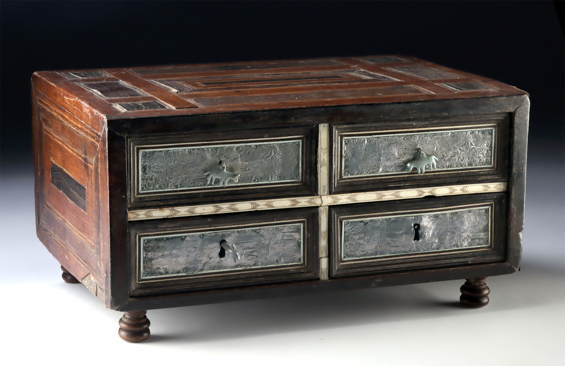 Latin to South America, Spanish Colonial era, ca. 18th to 19th century CE. A lovely marquetry storage box constructed with ebony and mahogany veneers, inlaid with contrasting honey-toned hardwood, elephant ivory, and engraved silver panels. The geometric veneer arrangement frames the top and sides, while the silver drawer fronts display abstract scrolling and stippled motifs. Small silver animal-form milagro charms serve as pulls on the upper drawers. The lower drawers retain functioning locks, and the original key is included, securing both compartments. Raised on four turned feet, the box is elevated to help protect stored documents and personal items from moisture. Size: 15.6″ L x 10.6″ W x 8″ H (39.6 cm x 26.9 cm x 20.3 cm); silver quality: 76% to 95%
