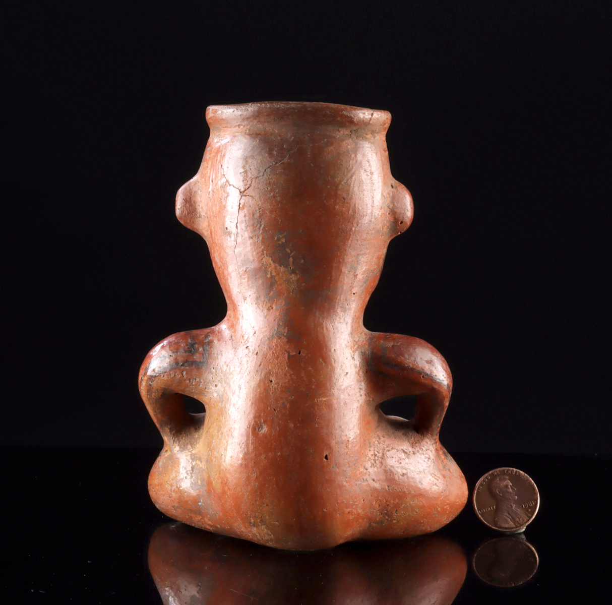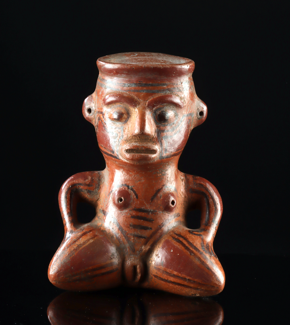 Pre-Columbian, Central America, Costa Rica, Nicoya region, ca. 800 to 1200 CE. A finely modeled Nicoya pottery figure depicting a seated nude female with legs drawn upward and arms resting at the sides of the torso. The figure displays exposed breasts and clearly delineated genitalia, emphasizing themes of fertility and the human body that appear frequently in Nicoya ceramic sculpture. The head is broad with large circular eyes, an open mouth, and pierced ears, while painted linear motifs accent the face and torso. The vessel is hollow and open at the top of the head, suggesting it functioned as a small container or ritual vessel. The warm red-orange slip is enhanced with dark painted details that highlight facial features, body markings, and decorative bands across the forehead. Figural ceramics such as this were widely produced in the Nicoya region of ancient Costa Rica and were often associated with ritual activity, ancestor veneration, or symbolic representations of fertility and life cycles within pre-Columbian societies. Size: 3.7″ W x 5″ H (9.4 cm x 12.7 cm)
