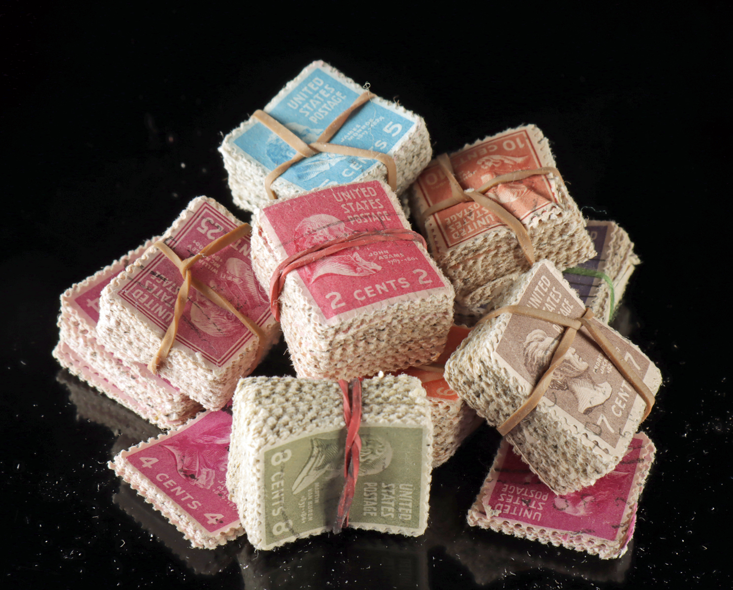 North America, United States, ca. 20th century CE. A clever and historically engaging grouping of United States postage stamps, each linking presidential order to denomination in a quietly ingenious numerical system. The series aligns cent values with presidential succession, from 2 cents depicting John Adams, the second president, through higher denominations honoring figures such as James Monroe, Andrew Jackson, and William McKinley, the twenty-fifth. Printed in characteristic mid-century tones – rose, violet, blue, green, and sepia – each stamp bears a finely engraved portrait framed by clean typographic borders. The examples are presented in small bundled stacks, still secured with period rubber bands, preserving their original utilitarian form. All stamps have been cancelled, their surfaces marked with postal ink, subtle traces of circulation that speak to their former life in transit. Size (all about the same): 0.8″ W x 1″ H (2 cm x 2.5 cm)
