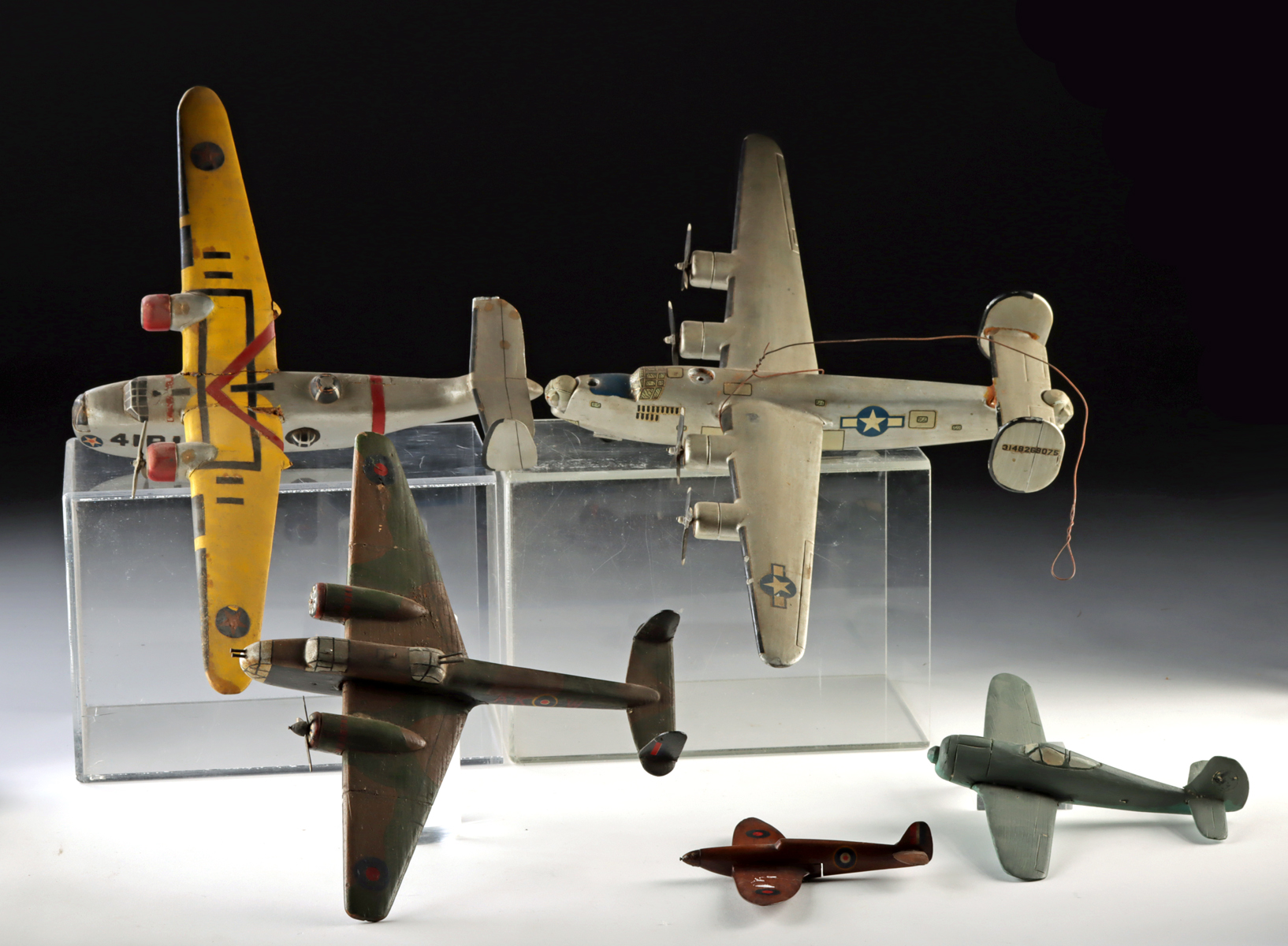 United States, ca. mid-20th century CE. A collection of five hand-painted wooden model airplanes representing World War I and II military aircraft. The group includes larger multi-engine bombers and smaller fighter planes, detailed with period insignia, cockpit windows, and painted camouflage schemes. Offered as display pieces with visible age wear that adds to their vintage character. Size: 18.25″ L x 11″ W (46.4 cm x 27.9 cm)