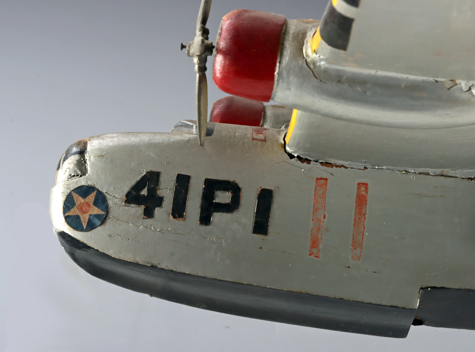Condition: Repairs and losses present. Wings and fins have been reattached on the two larger planes. Several metal propellers are missing. Surface chips, abrasions, stains, and areas of discoloration throughout.