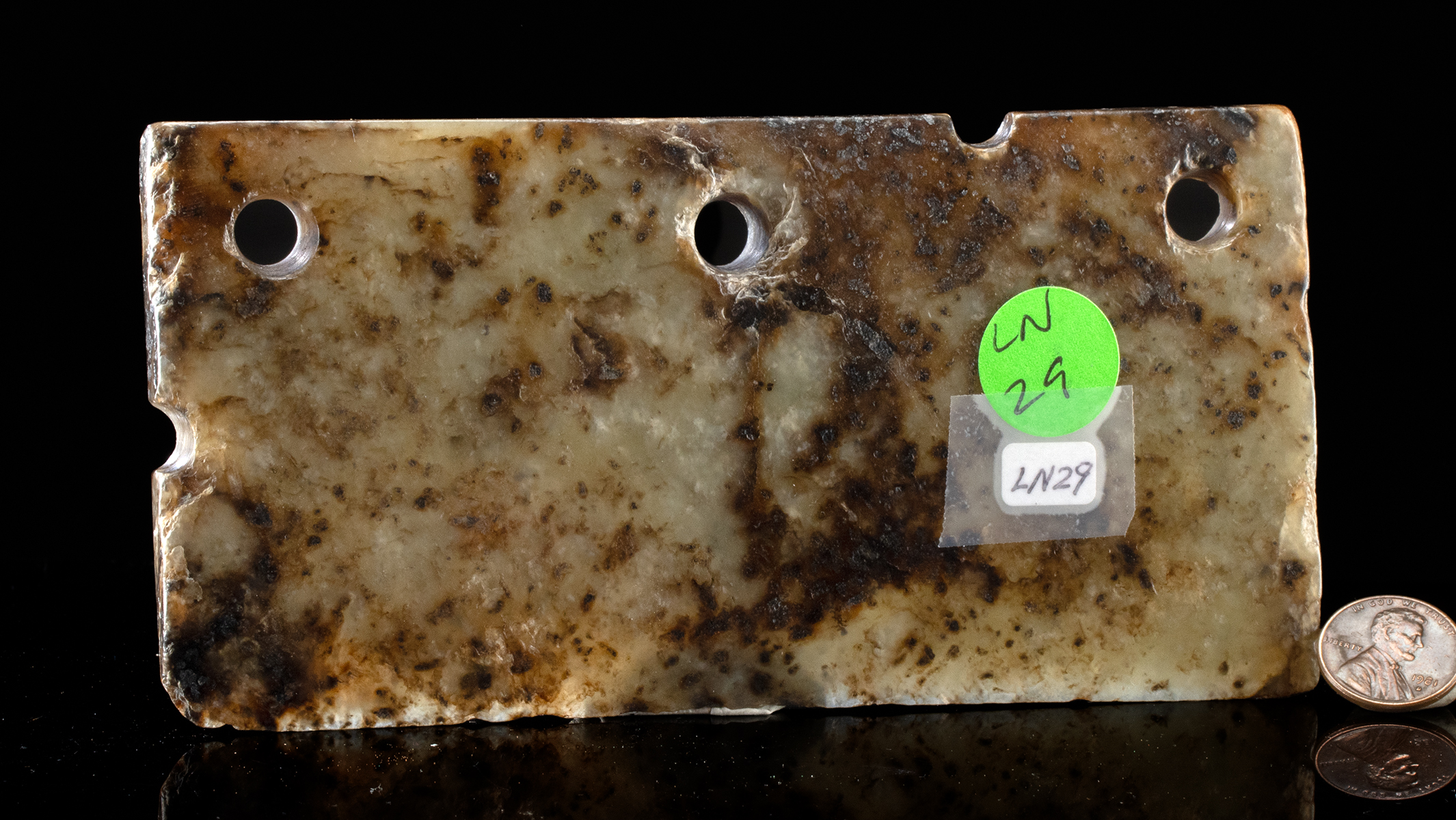 East Asia, China, Shang Dynasty, Erlitou Period, ca. 1900 to 1500 BCE. A rare nephrite jade ceremonial axe dating to the Erlitou period of the early Shang Dynasty, its surface marked by mottled hues of green, brown, and cream that testify to millennia of burial. The elongated, rectangular blade is thinly worked, its edges finely ground, and it bears four drilled perforations near the top for hafting or suspension. A small notch is cut at the side, characteristic of ritual implements intended for display rather than practical use. Ceremonial jade axes, or yue, were powerful symbols of authority and ritual power in early Bronze Age China. Unlike utilitarian bronze weapons, jade examples were associated with elite status, used in ritual contexts to represent divine mandate and military command. The labor-intensive carving of nephrite – one of the hardest stones – underscores both the value of the material and the prestige of the individual to whom it belonged. Size: 6″ L x 3″ W (15.2 cm x 7.6 cm)