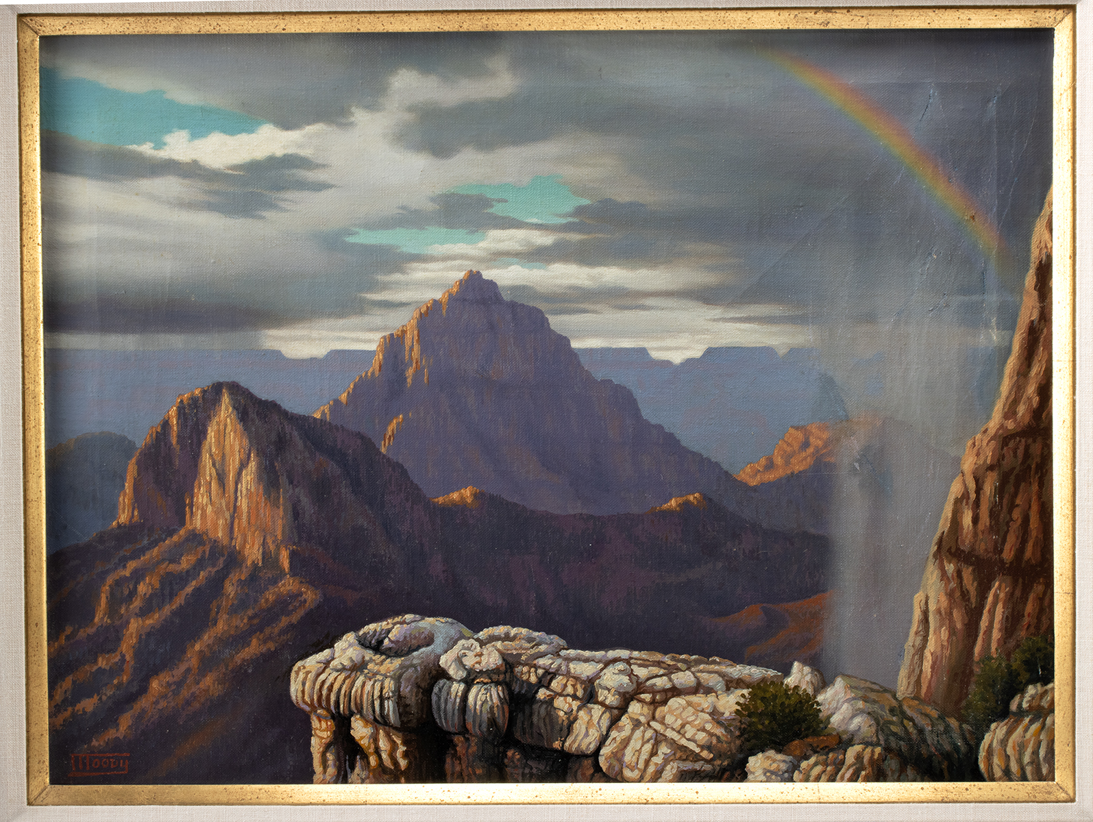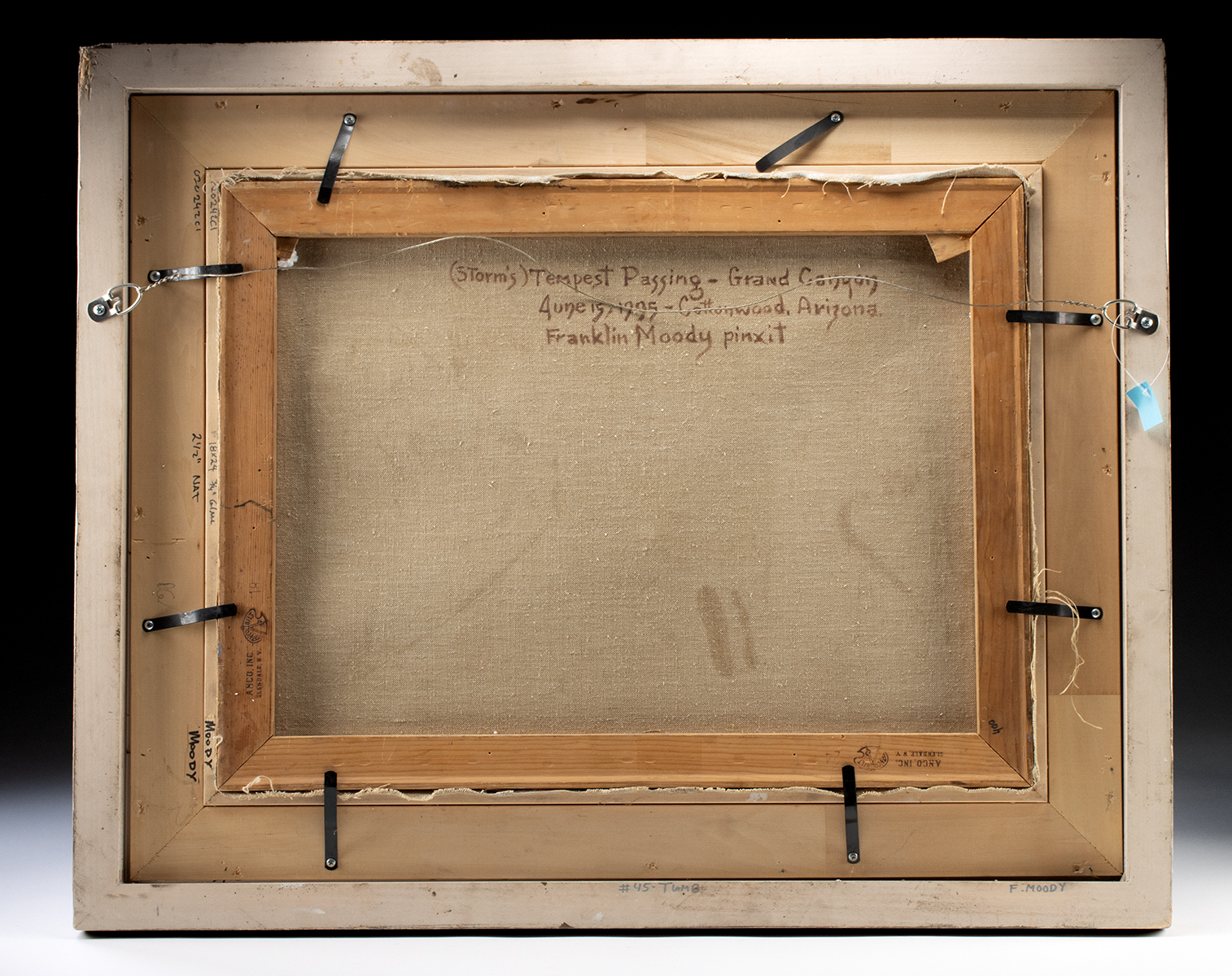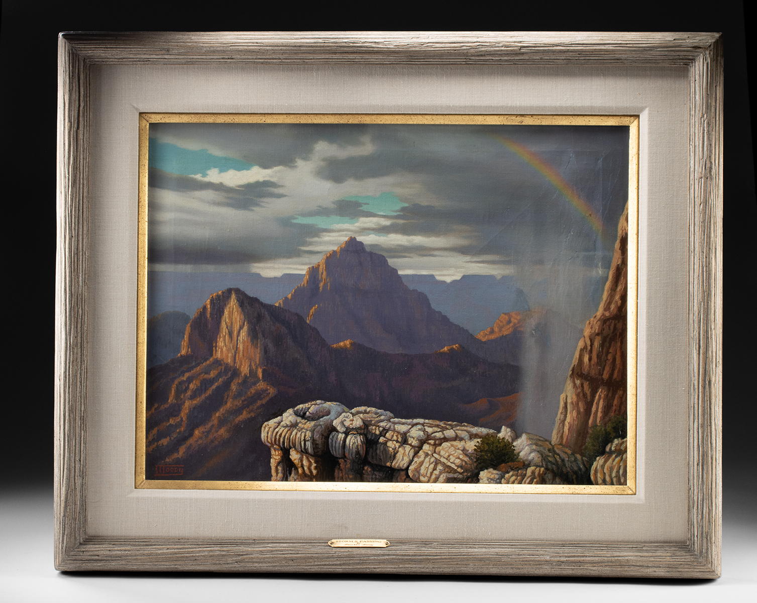 Franklin Moody (American, b. 1924). “(Storm’s) Tempest Passing – Grand Canyon” oil on canvas, 1995. Signed at lower left and again with title and date on verso. Bronze plaque with title and artist’s name on frame beneath painting. A rainbow breaks through the retreating storm as light returns to the vast stone amphitheater of the Grand Canyon, and Franklin Moody captures that fleeting moment when drama softens into clarity. In “(Storm’s) Tempest Passing – Grand Canyon,” painted in 1995, Moody renders the canyon not as static geology but as a living stage of weather, shadow, and revelation. The composition is anchored by a commanding butte rising in the middle distance, its sunlit planes glowing in warm tones of ochre and russet against deep violet shadows. In the foreground, a massive rock ledge stretches outward, its pale, striated surface articulated with careful attention to texture and form. Size of painting: 23.5″ W x 17.5″ H (59.7 cm x 44.4 cm); of frame: 32.5″ W x 26.5″ H (82.6 cm x 67.3 cm)