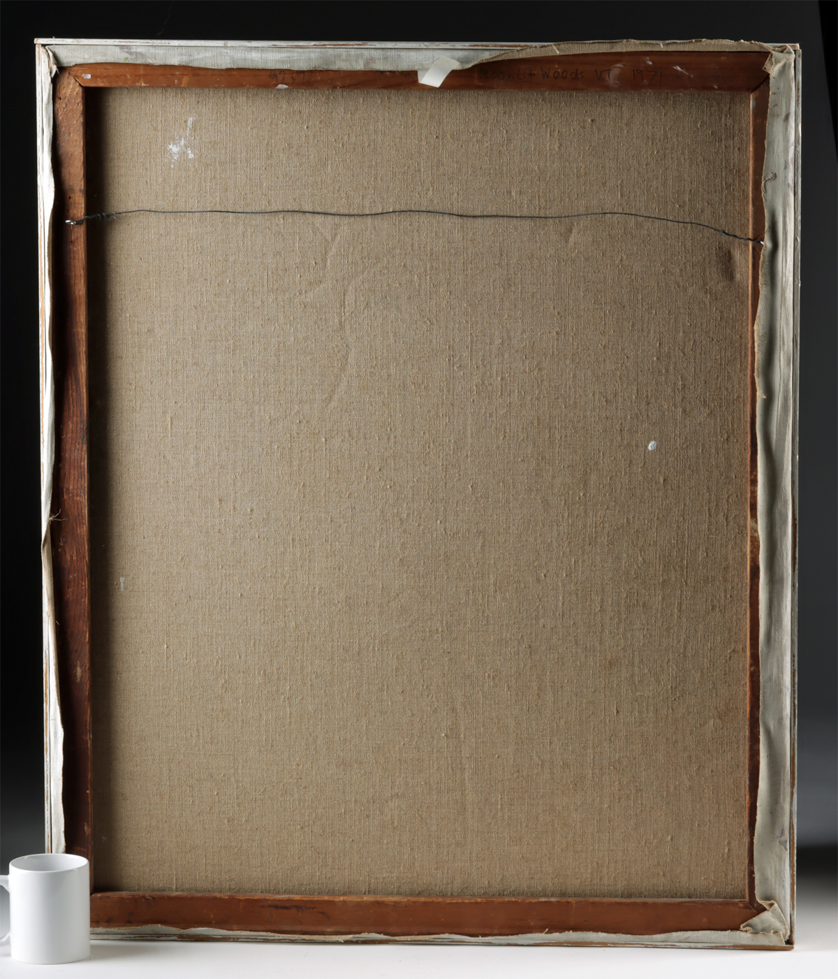 Edith Kramer (Austrian born American, 1916-2014). “Moonlit Woods, Vermont” oil on canvas, 1971. Signed and dated at lower right. Titled and dated on verso. Inscribed “Night Painting” on top edge. Bathed in the cool hush of nocturnal light, Edith Kramer’s “Moonlit Woods, Vermont” evokes the mystery and quiet pulse of the natural world after dark. Painted directly under moonlight – as the artist’s inscription suggests – the work captures the Vermont forest not as a static scene, but as a living, breathing presence. Swaths of muted violet, blue-gray, and deep green coalesce into rhythmic abstractions of foliage and shadow, suggesting the movement of leaves in a whispering wind. The composition reveals Kramer’s mastery of tonal subtlety and emotional restraint. Her Bauhaus-influenced training under Friedl Dicker and the color theories of Johannes Itten resonate here in the painting’s carefully balanced contrasts of darkness and luminosity. Size of painting: 29.75″ W x 35.75″ H (75.6 cm x 90.8 cm); of frame: 30.75″ W x 36.5″ H (78.1 cm x 92.7 cm)