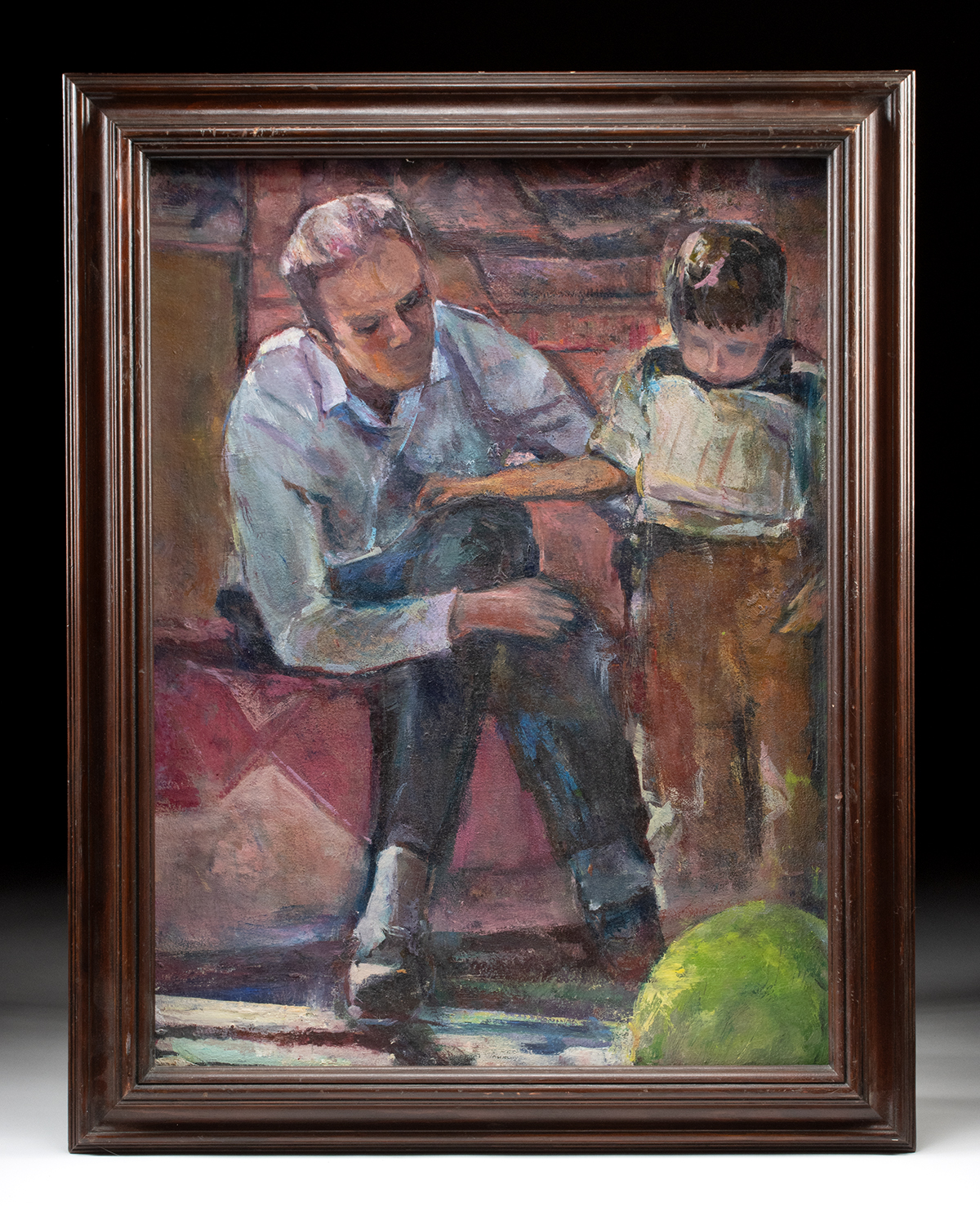 Arthur Knebel (American, 1925-2013). “Joe Lucero and Kid” oil on canvas, n.d. Unsigned. A gentle hush settles over Arthur Knebel’s oil on canvas “Joe Lucero and Kid”, a work that leans toward the poetic warmth for which the artist was known. Knebel captures a private, unguarded moment between an adult mentor and a young boy, their figures seated side by side in an atmosphere that feels both lived-in and contemplative. The adult leans forward, elbow resting on his knee, his attention fully given to the child, who bends intently over an open book. Their bodies form a quiet arc of connection, one figure guiding, the other absorbing. The composition is built on Knebel’s signature interplay of realism and abstraction. Blocks of earthy red, brown, and ochre rise behind the pair like softened masonry, lending the scene a weathered texture that hints at memory rather than strict documentation. Size of painting: 17.5″ W x 23.5″ H (44.4 cm x 59.7 cm); of frame: 22″ W x 28″ H (55.9 cm x 71.1 cm)