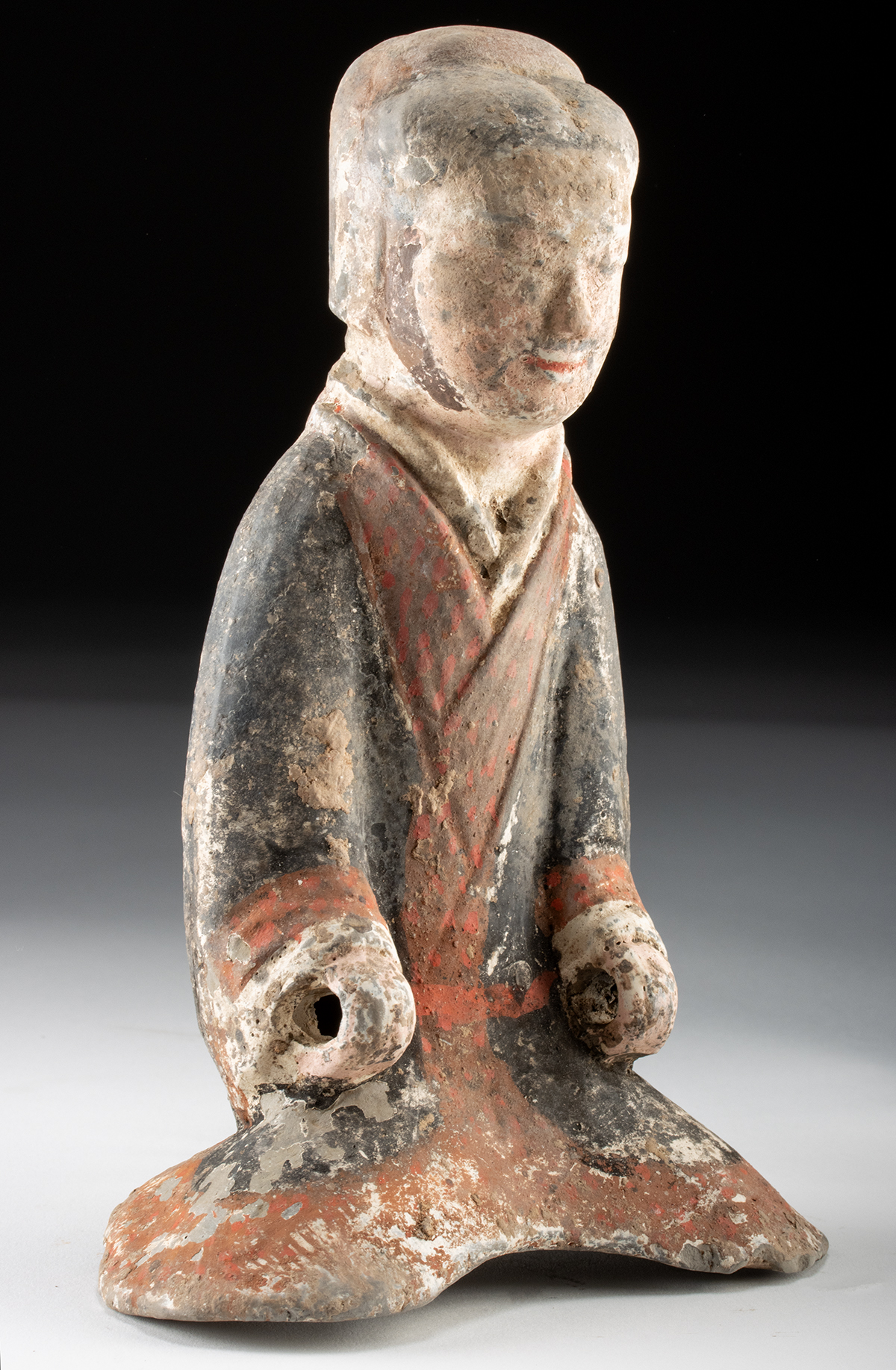 East Asia, China, Han Dynasty, ca. 206 BCE to 220 CE. A quietly dignified horse rider sits in composed stillness, his posture upright and ceremonial, offering a vivid glimpse into the martial ideals and funerary beliefs of Han dynasty China. Modeled in pottery and once brightly painted, the figure wears a long robe rendered in dark pigment, its lapels and sash highlighted with traces of red that remain visible despite centuries of burial. The garment falls in a broad, flared silhouette, concealing the legs and creating a stable base that suggests the presence of a mount beneath, now absent. His hands are hollowed and positioned forward, originally intended to grasp reins or riding equipment, reinforcing the identification of the figure as an equestrian. Size: 5.6″ W x 8.4″ H (14.2 cm x 21.3 cm)