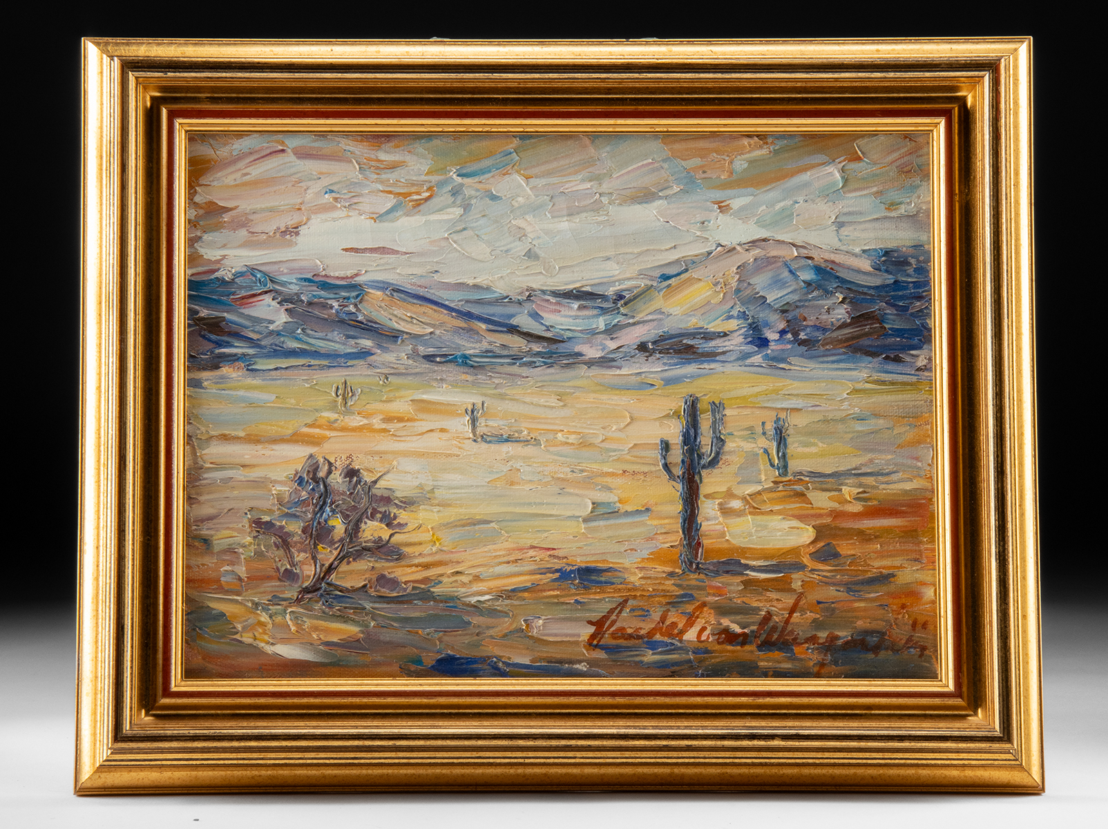 Nachel van Wanginheim (active XX-XXI century). Desert Scene. Palette knife oil on canvas, n.d. Signed at lower right. A blaze of color and texture sweeps across this dynamic desert landscape by Nachel van Wanginheim, where earth and sky are built not with a brush, but with the decisive stroke of a palette knife. Rendered in thick, sculptural impasto, the composition depicts an expansive arid plain punctuated by tall saguaro cacti and sparse desert growth. In the distance, a range of violet and ultramarine mountains rises beneath a restless sky layered with pale cream, blue, and soft rose. The foreground glows with warm ochres, amber, and rust tones, broken by strokes of cobalt and slate that suggest shadow and shifting light across sand and scrub. Size of painting: 11.5″ W x 8.5″ H (29.2 cm x 21.6 cm); of frame: 15″ W x 12″ H (38.1 cm x 30.5 cm)
