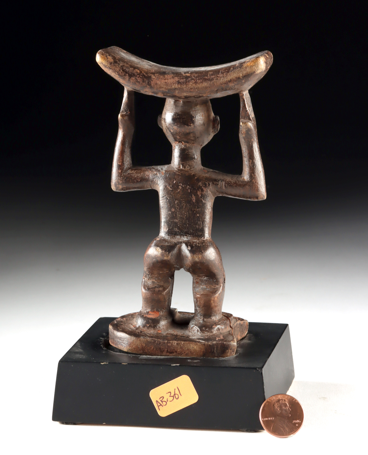Central Africa, Democratic Republic of the Congo, Luba / Hemba culture, ca. early 20th century CE. A small-scale wood caryatid headrest carved as a nude female ancestral figure, shown standing upright and supporting the curved rest on her head and raised fingertips. The compact proportions suggest it may have been intended as a portable headrest, a child’s object, or a votive or symbolic form rather than a fully functional example. The carving emphasizes the human form as a structural and spiritual support, reflecting the association of headrests with ancestry, protection, and the safeguarding of the head during rest. Size: 2.75″ W x 4.5″ H (7 cm x 11.4 cm); 6.25″ H (15.9 cm) on included custom stand.
