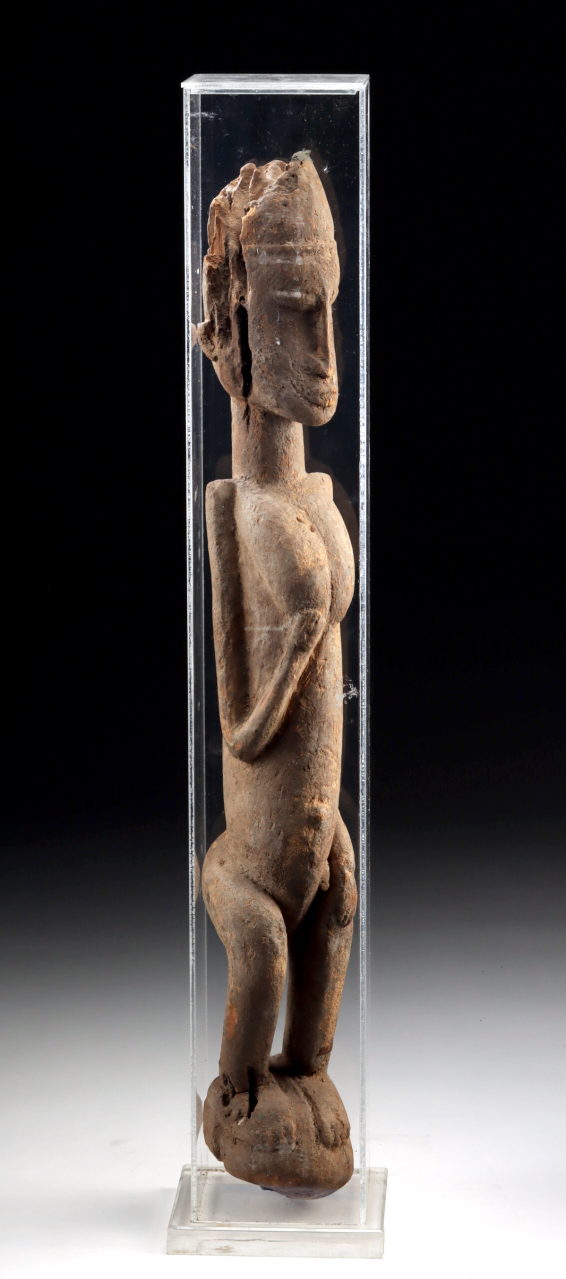 West Africa, Mali, Dogon culture, ca. early 20th century CE. A carved Dogon wood figure depicting a standing nude female with legs slightly bent and arms arranged in a modest, inward gesture. One hand rests against her breast while the other is placed along the upper thigh, creating a pose that recalls the classical Venus pudica stance while remaining firmly grounded in Dogon sculptural tradition. The figure is elongated and frontal, with a tall cylindrical torso, softly modeled limbs, and a rounded head topped by a simplified coiffure or headdress. The surface shows signs of age and use, with areas of wear, erosion, and a dry, matte patina consistent with ritual handling. Dogon figures of this type were often associated with fertility, ancestry, and idealized womanhood, serving as objects of veneration rather than purely decorative works. The restrained facial features and calm posture emphasize balance and composure, key qualities in Dogon aesthetics. Size: 4.7″ L x 4″ W x 29.1″ H (11.9 cm x 10.2 cm x 73.9 cm); 31.75″ H (80.6 cm) on included custom stand.