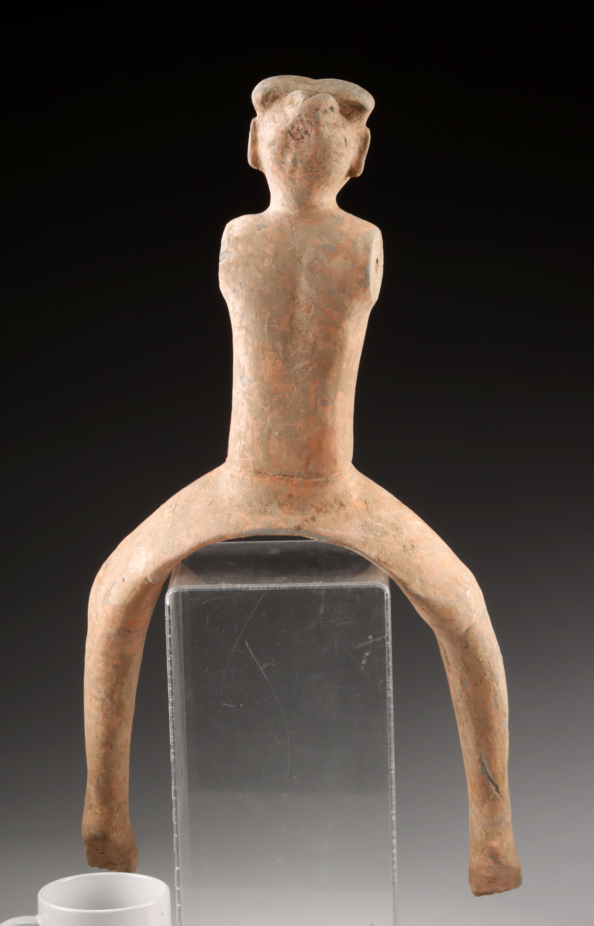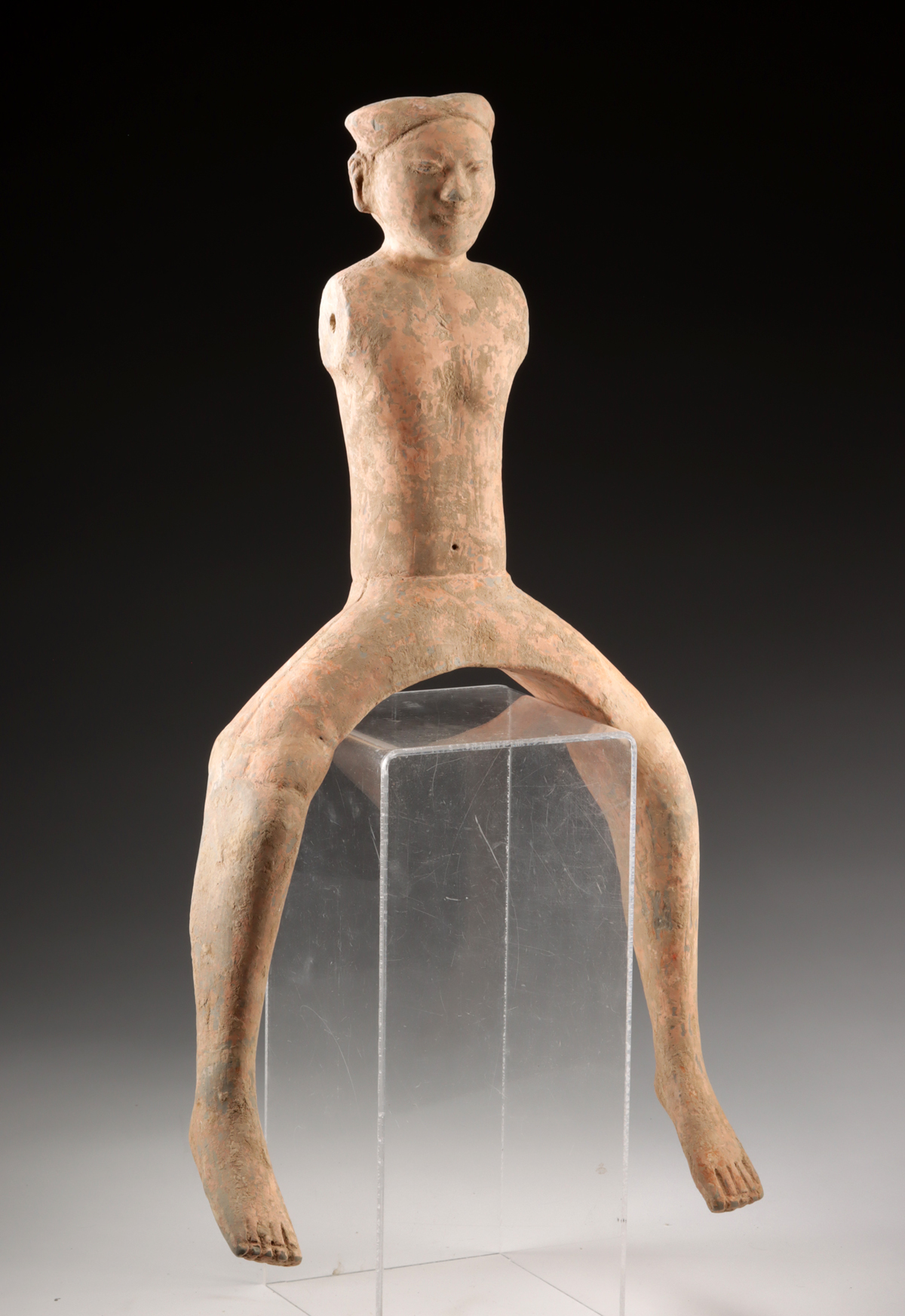 East Asia, China, Han Dynasty, ca. 206 BCE to 220 CE. A powerful and animated pottery figure of a horse rider captures the Han Dynasty fascination with movement, status, and the expanding world beyond the court. Modeled at an impressive scale, the rider is shown seated astride an absent horse, his legs dramatically arched to convey the animal’s breadth and motion, creating a sculptural presence that remains striking even in isolation. The figure is formed in buff earthenware with subtle traces of original surface pigmentation, now softened by age. The rider’s torso is upright and balanced, with arms once attached at the shoulders, likely positioned to hold reins or gesture forward. His face is calmly rendered with almond-shaped eyes, a faint smile, and a composed expression that contrasts with the implied dynamism of the pose. A simple cap or headpiece frames the head, a detail often associated with rank or military identity during the period. Size: 5.9″ L x 11.1″ W x 21.5″ H (15 cm x 28.2 cm x 54.6 cm)