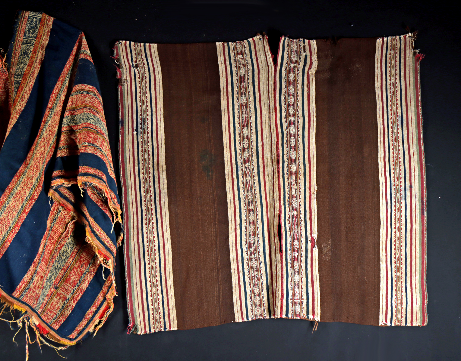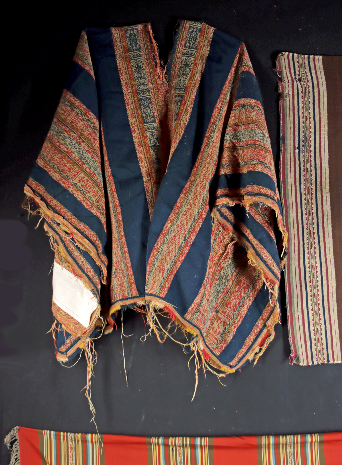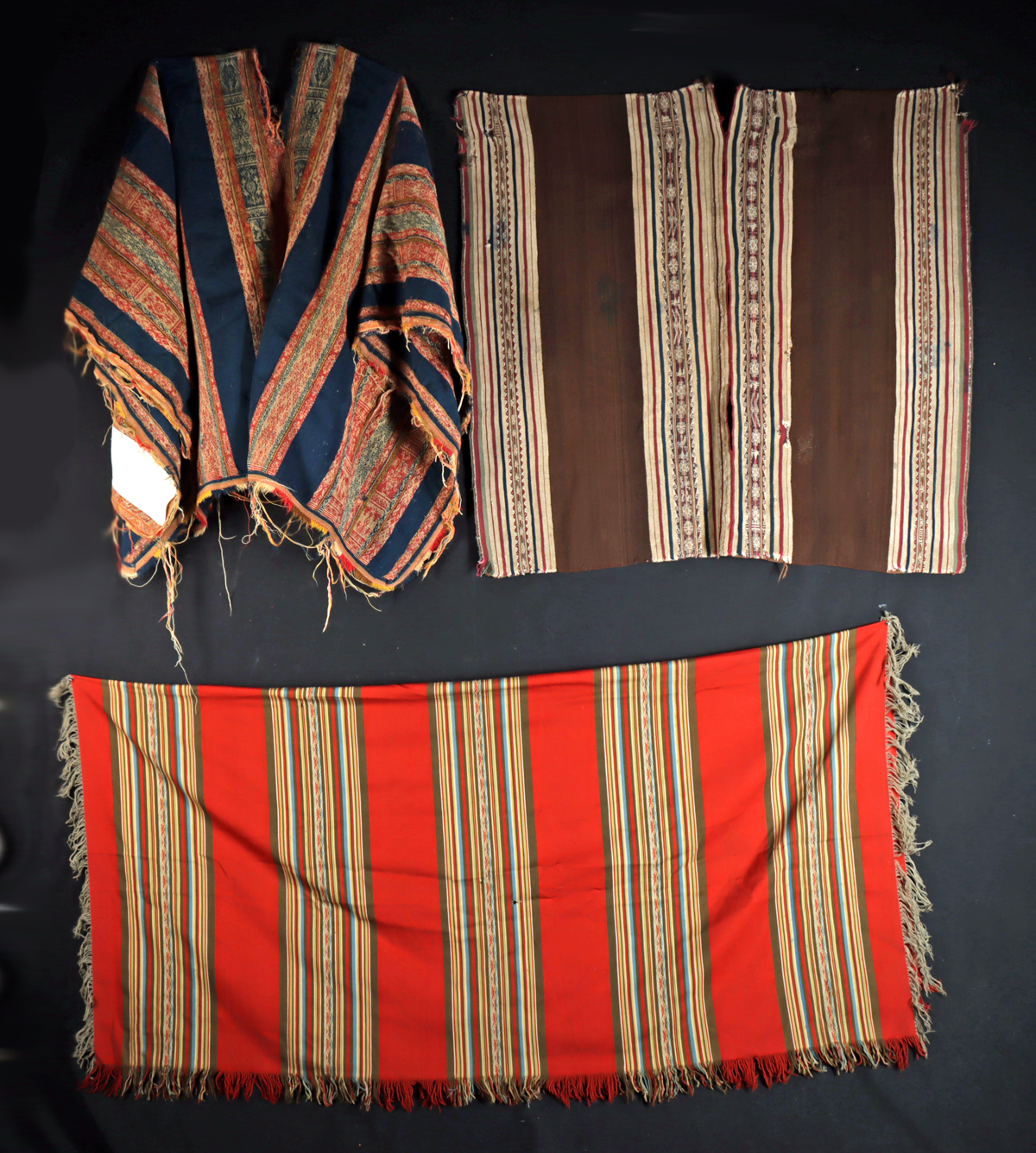 Condition: Blue stripe poncho and brown are heavily worn with holes, tears, fraying, and losses to fibers. The blue poncho has a cotton backing added along one edge, possibly for display purposes. Red textile has small holes and small areas of fiber losses, and some light discoloration.
