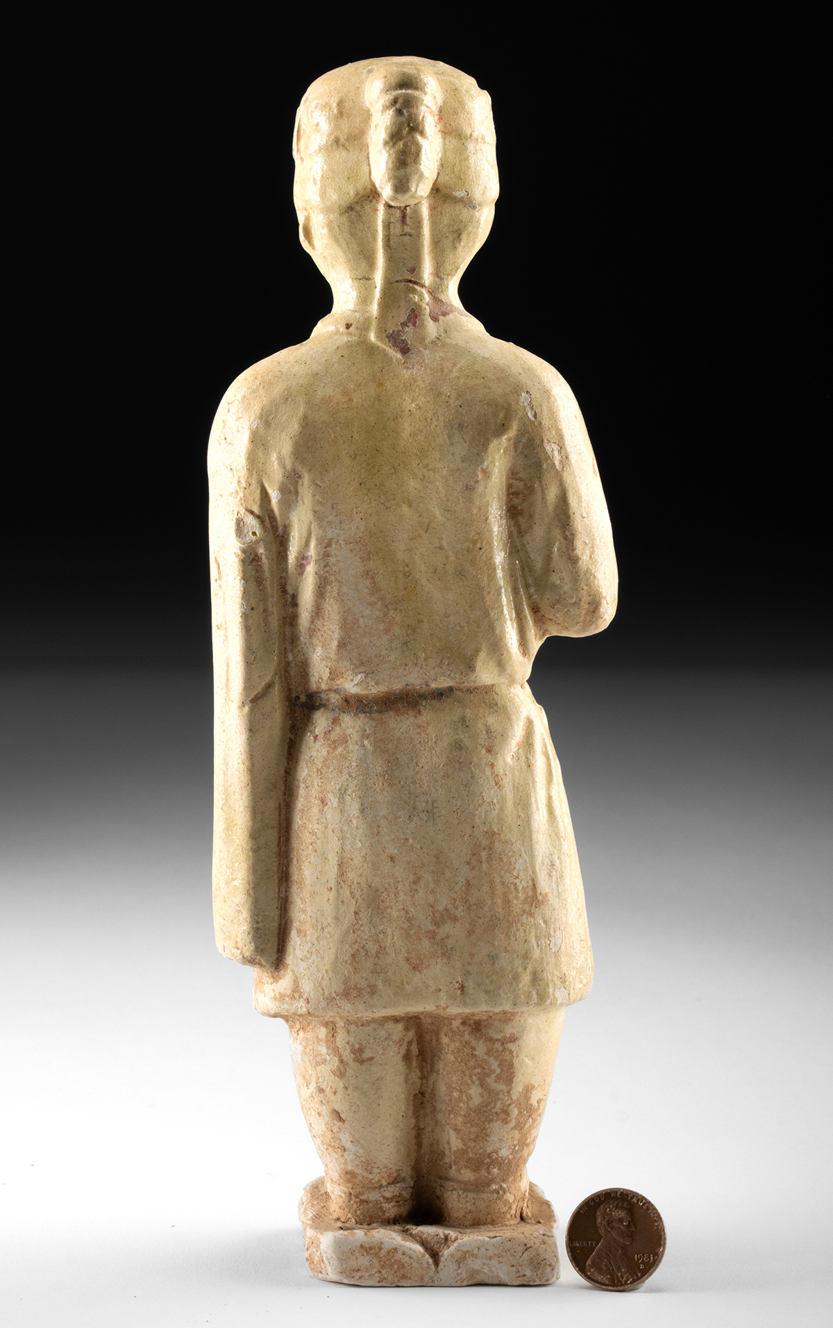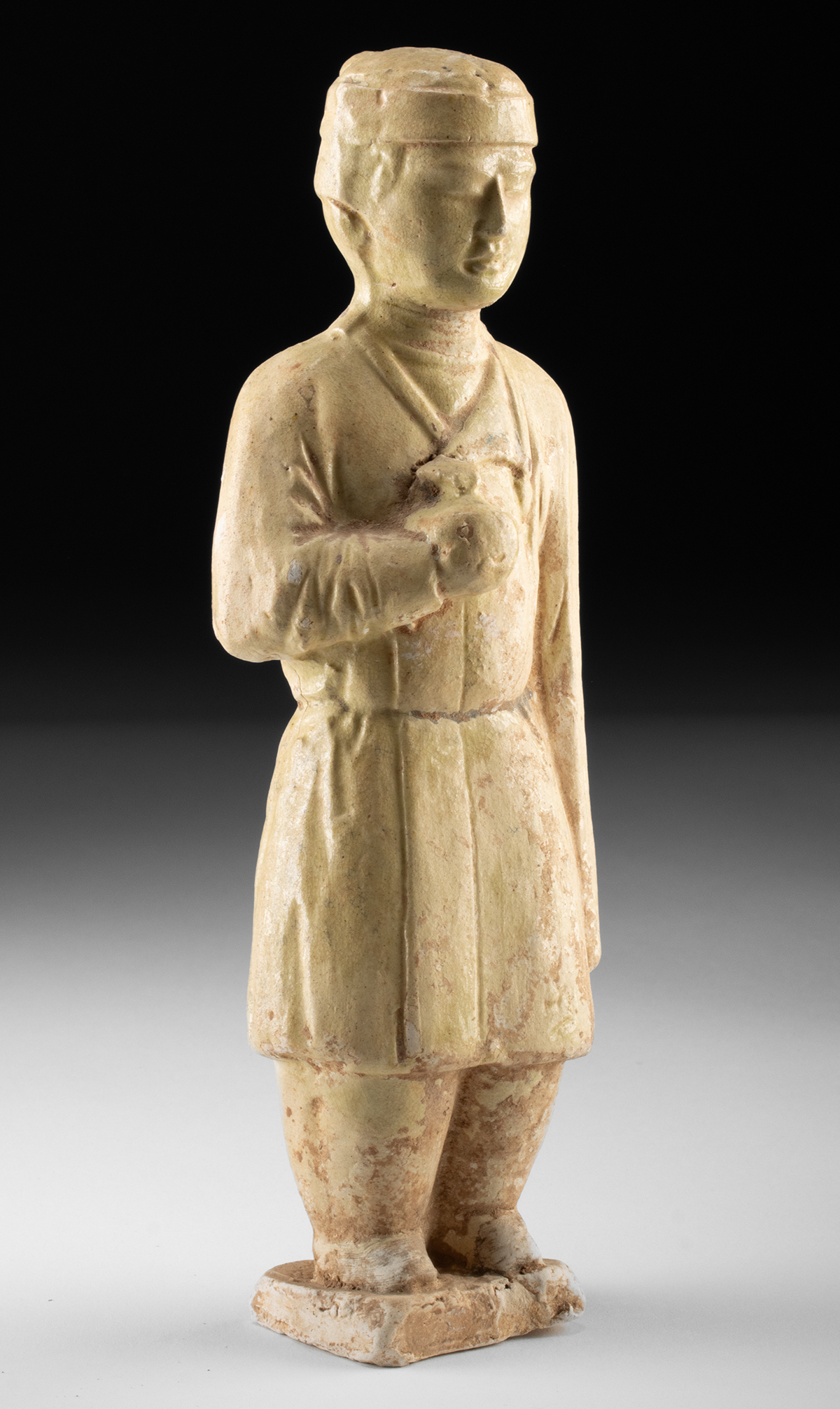East Asia, China, Sui Dynasty, ca. 581 to 618 CE. A quiet figure of service and ritual presence, this straw-glazed pottery attendant stands in composed stillness, embodying the transitional elegance of early medieval China. Modeled in earthenware and covered with a pale straw glaze, the figure wears a knee-length robe tied at the waist, its folds simply indicated yet rhythmically balanced. The surface retains soft variations in tone where the glaze has pooled and thinned, allowing the clay body to show through in places. Traces of burial wear and mineral accretion lend the figure a softened, time-worn presence that underscores its funerary origin. The attendant holds a rounded vessel close to the chest with one hand, while the other arm hangs calmly at the side. This gesture suggests the offering of wine, food, or ritual goods, a role commonly assigned to tomb figures intended to serve the deceased in the afterlife. Size: 3.1″ W x 9″ H (7.9 cm x 22.9 cm)