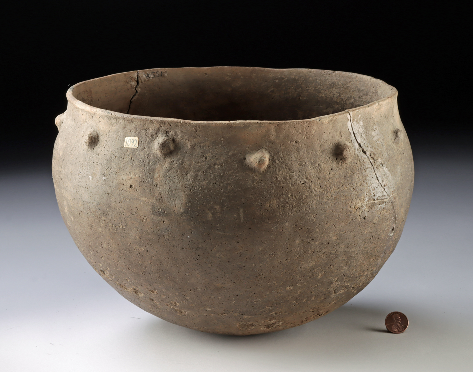 Native American, Southeastern United States, Mississippian culture, ca. 800 to 1600 CE. A commanding earthenware bowl of generous scale, its broad, rounded body crowned by a rhythmic procession of raised lugs that encircle the rim like quiet sentinels. The vessel’s hemispherical form rests on a subtly curved base, its surface bearing the soft, mottled tones of earth and fire – warm browns and smoky grays that speak to its passage through an open firing environment. Hand-built using coiling techniques and carefully smoothed, the bowl reveals a tactile surface with visible inclusions and subtle irregularities, hallmarks of Mississippian ceramic practice. The evenly spaced lugs, pinched and applied along the rim, may have served both functional and symbolic roles – providing grip or attachment points, while also creating a visual cadence that animates the otherwise restrained form. Size: 11.3″ Diameter x 8″ H (28.7 cm x 20.3 cm)