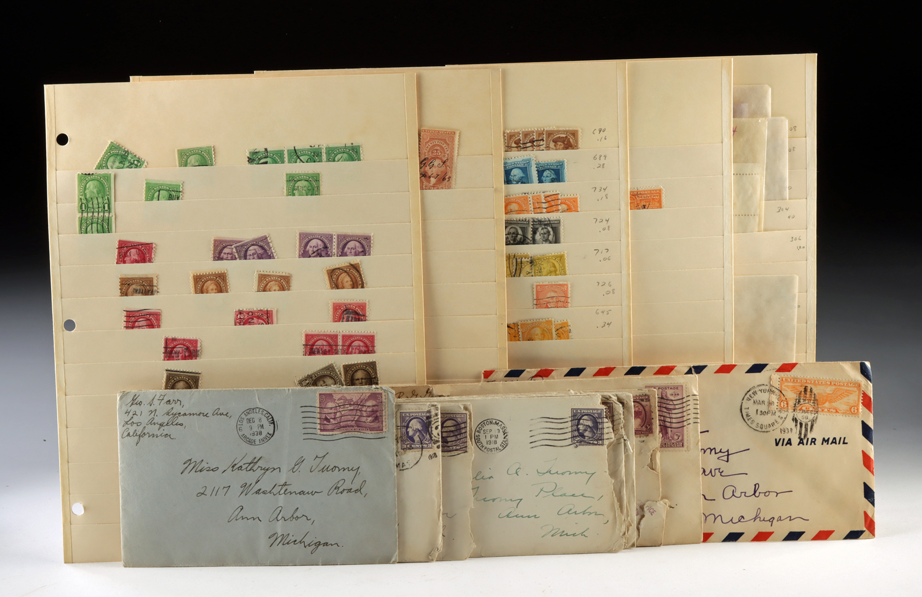 United States, ca. early to mid-20th century CE. A three-ring binder album containing several pages of collected United States postage stamps, including assorted early issues with cancellation marks and used examples arranged in glassine envelopes and album pages. Approximately 150 stamps total. The group also includes several postmarked envelopes dating to 1918 and later, addressed and mailed within the United States. Size: 11.5″ L x 10″ W (29.2 cm x 25.4 cm)