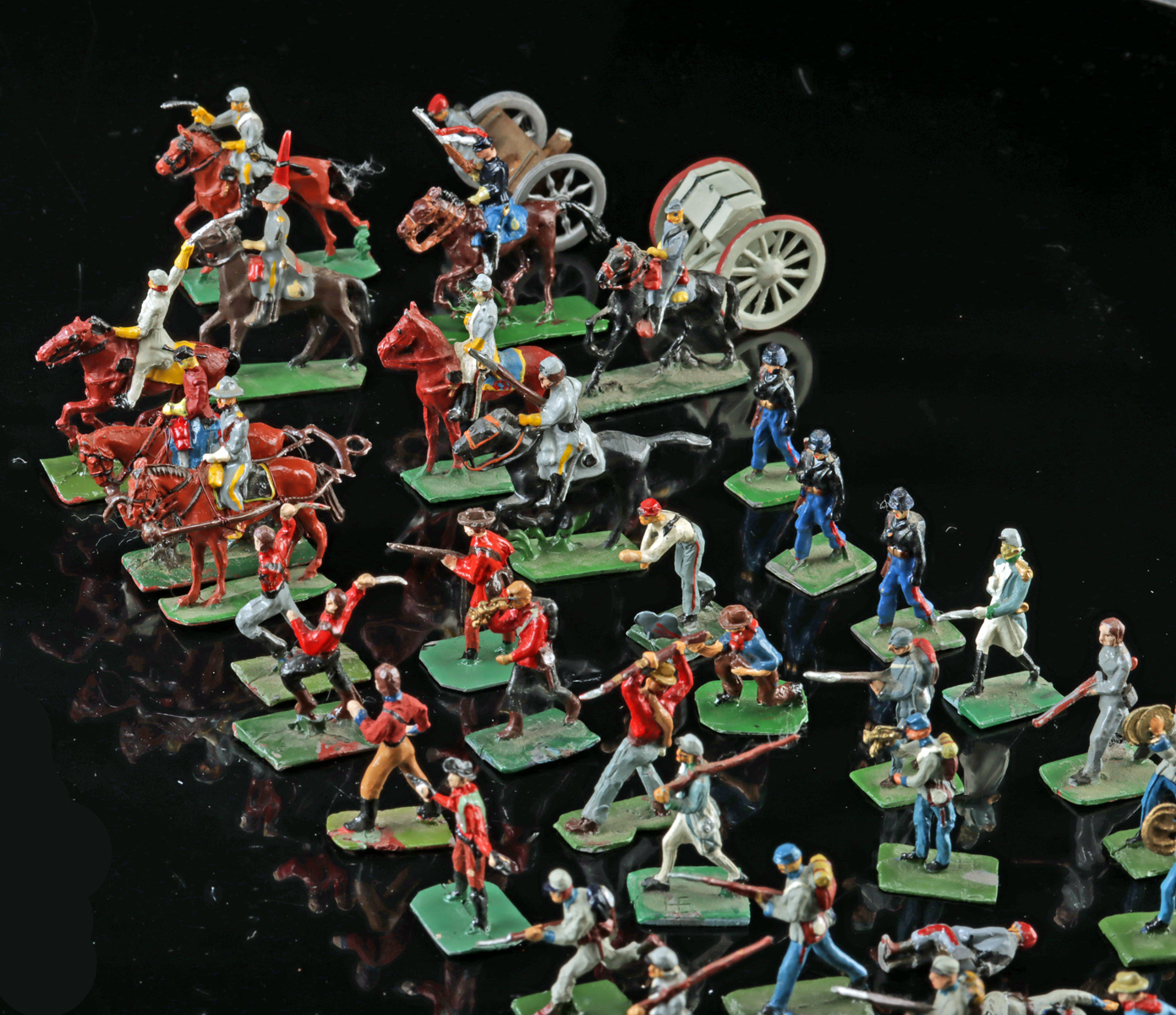 England / South Africa, ca. mid-20th century CE. An assorted group of lead miniature soldier figures depicting primarily United States Civil War-era Union and Confederate troops, including infantry, cavalry, cannons, medics, resting soldiers, campfires, and military musicians. These figures are approximately 32 mm scale and are stamped on the base “UNION OF S. AFRICA” and were produced during the 1950s – 1960s CE by the company Swedish African Engineers (SAE), based in South Africa. A small number of other mixed collections are included, such as American frontiersmen wearing coonskin caps and several Western gunslinger cowboys. Additionally, one slightly larger British World War II soldier figure is present and made by the Charles Stadden Miniatures company in England. Size of Civil War soldier: 1.25″ H (3.2 cm); Stadden figure: 2″ H (5.1 cm)