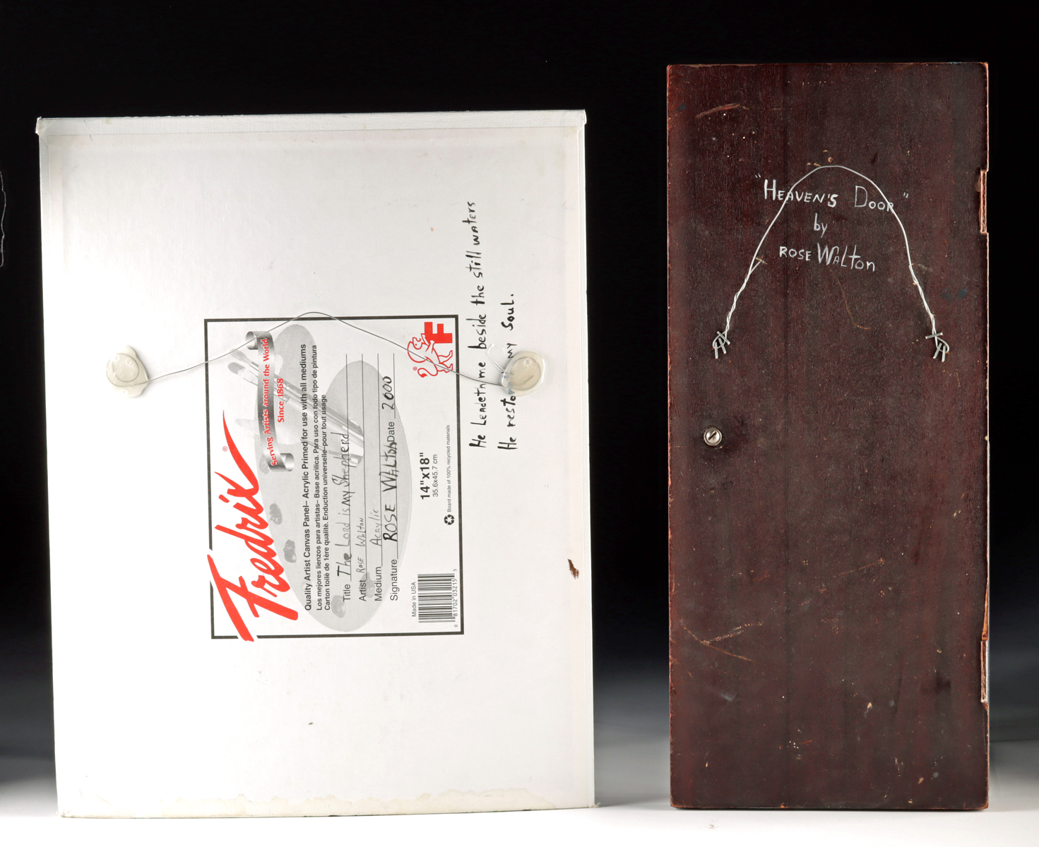 Rose Walton (American, XX-XXI). (1) “Heaven’s Door” paint on wood / repurposed cabinet door, n.d. (2) “The Lord is My Shepherd” paint on canvas board, 2000. First is initialed at left periphery. Second is initialed at lower right and dated on verso. Both are signed and titled on verso. A quiet, handmade theology unfolds across this pair of works, where belief is rendered not as doctrine but as story, symbol, and gentle wonder. Together, “Heaven’s Door” and “The Lord is My Shepherd” read like companion pages from a private book of visions, intimate, earnest, and touched with a childlike sense of discovery. “Heaven’s Door”, painted on a repurposed wooden cabinet door, transforms an everyday object into a threshold between worlds. A winged figure stands in profile against a deep, star-flecked blue, haloed and intent, extending a hand to a small glass knob that functions both as literal hardware and metaphysical handle. Size of larger (“Shepherd”): 14″ W x 18″ H (35.6 cm x 45.7 cm)