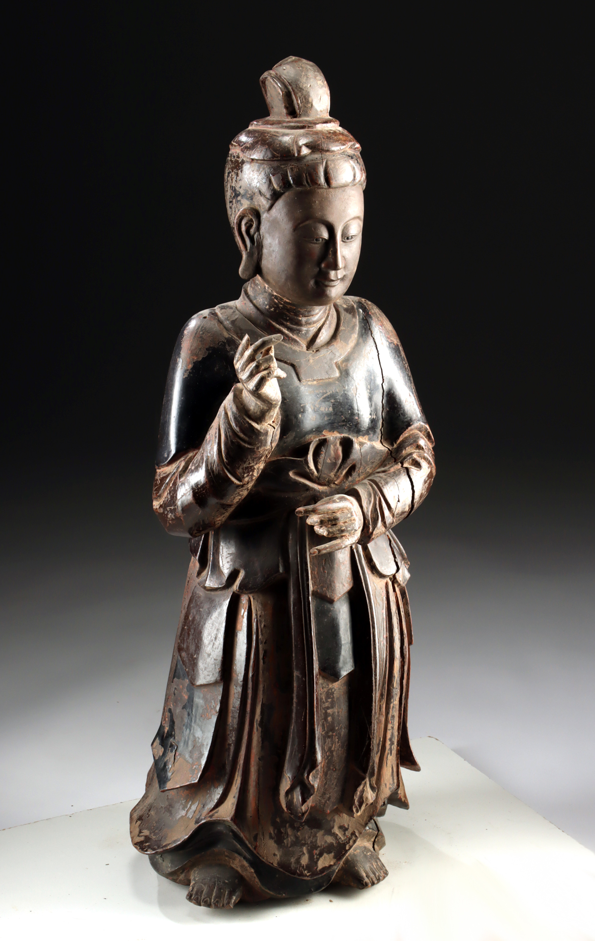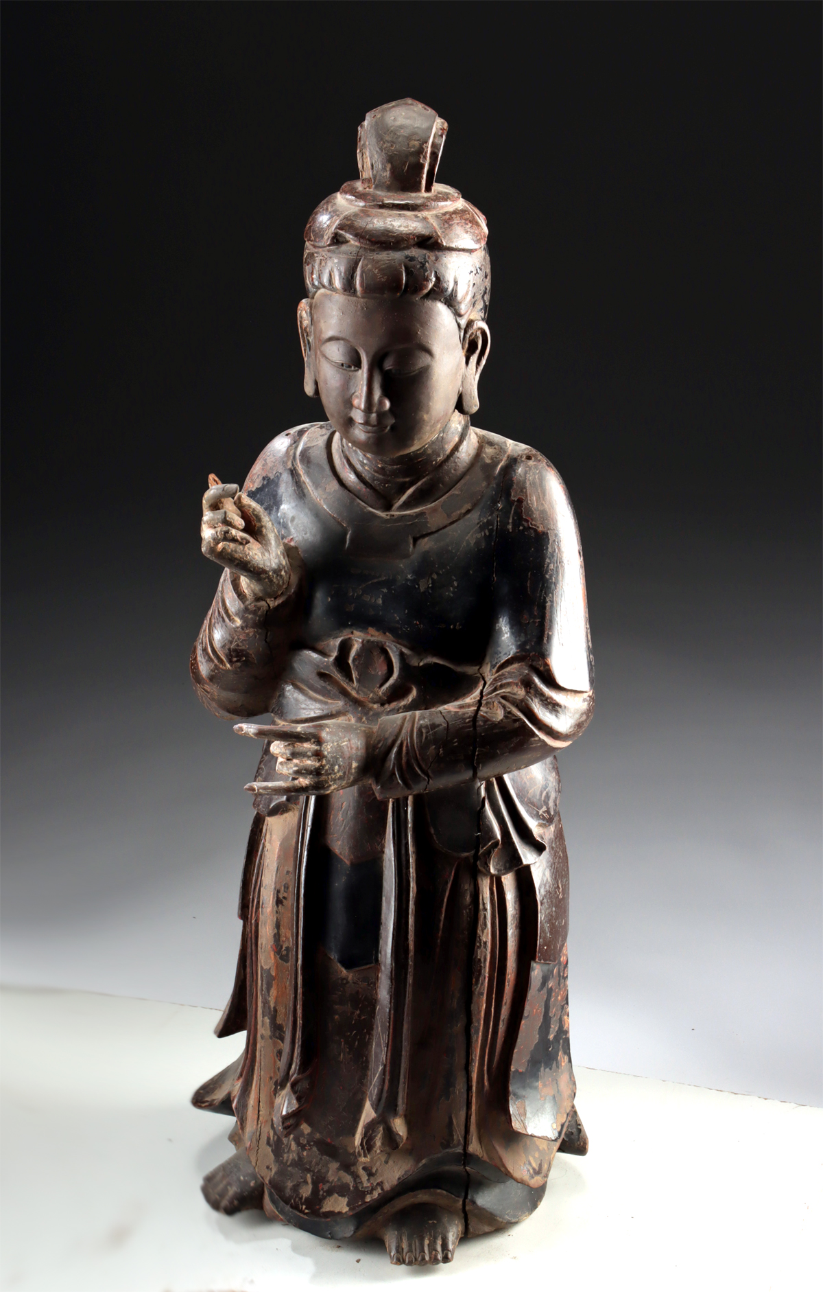 Condition: Missing one finger on proper right hand; professional repair to a few other fingers. Fissures to wood, as well as nick, scratches, and abrasions to surface as shown. Otherwise, good detail with rich patina to wood. Liberal remains of lacquer and very miniscule remains of gilding.