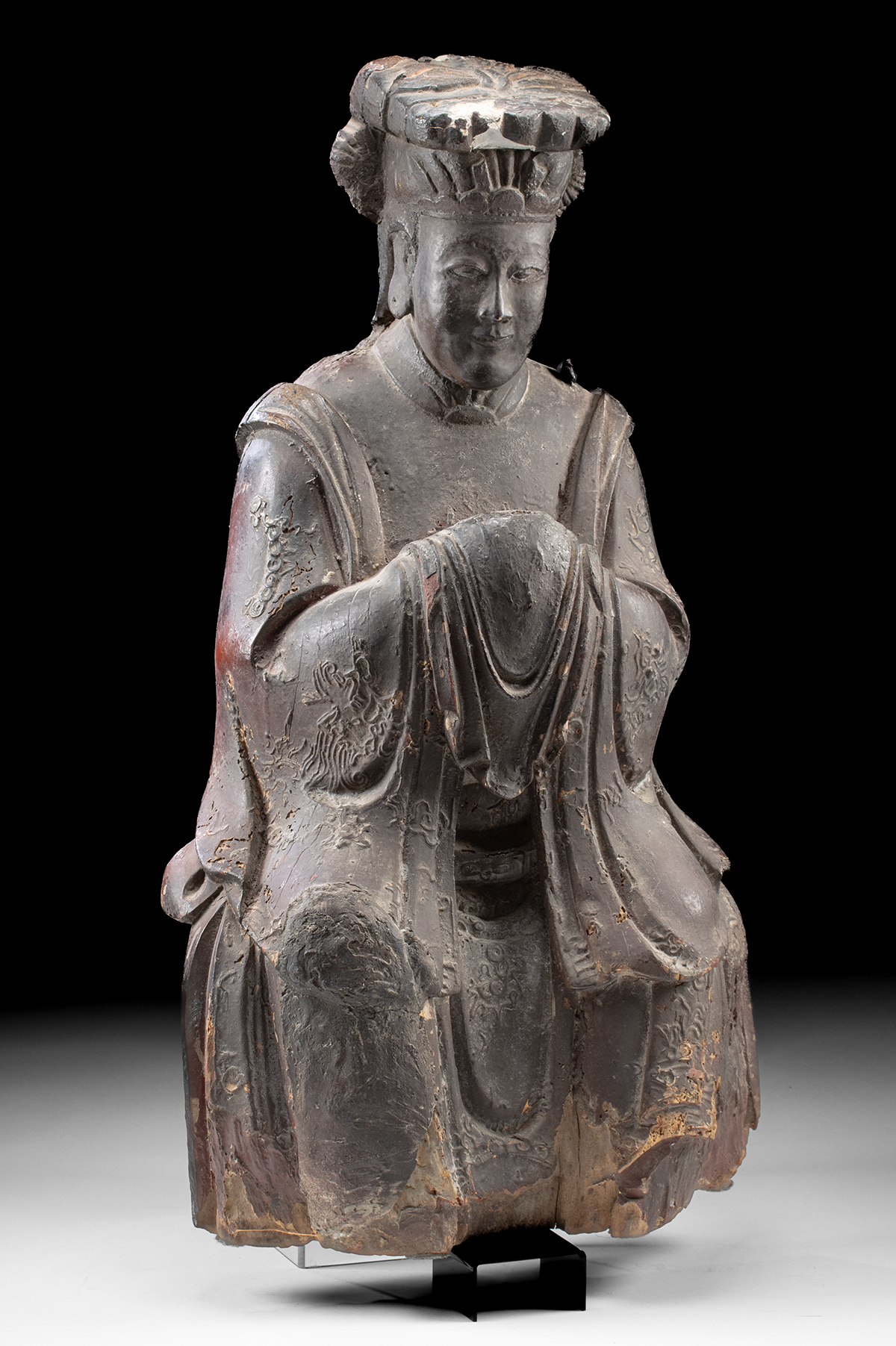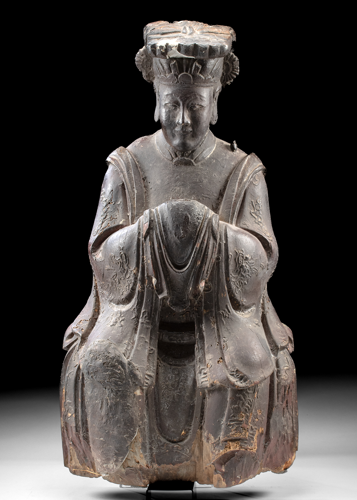 East Asia, China, Qing Dynasty, ca. 18th century CE. A venerable lacquered wood sculpture of Mazu (also known as Matsu), the beloved sea goddess of Chinese coastal folk religion, portrayed here in seated reverence, her hands held at the waist in a gesture of benevolent composure. Carved with formal restraint yet powerful spiritual presence, this figure depicts the deity in full court regalia, her posture upright and steady, embodying divine watchfulness. Her face is soft yet focused, the expression calm and inward, framed by an elaborate headdress. Her hair is pulled up in a formal topknot, flanked by circular side ornaments evoking celestial wheels or twisted shells. She wears layered robes with cascading sleeves, richly patterned with low-relief decoration, including stylized dragons – an imperial motif long associated with power, protection, and the cosmos. Size: 12.5″ L x 15.5″ W x 29.4″ H (31.8 cm x 39.4 cm x 74.7 cm)