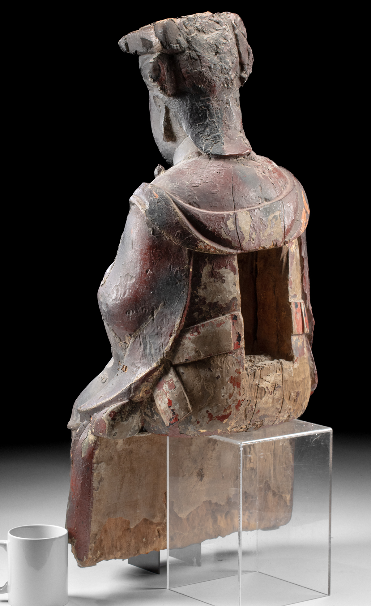 At the reverse, a large square cavity has been carved into the back, likely for consecration purposes – meant to house written sutras, talismans, or relics during a temple dedication ritual. The base is unsealed, exposing the raw wood and revealing the sculpture’s long devotional history.