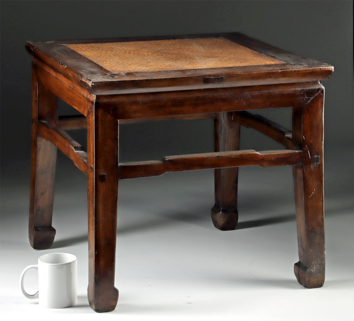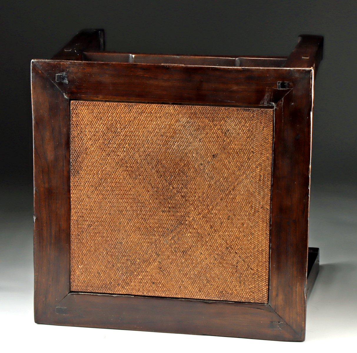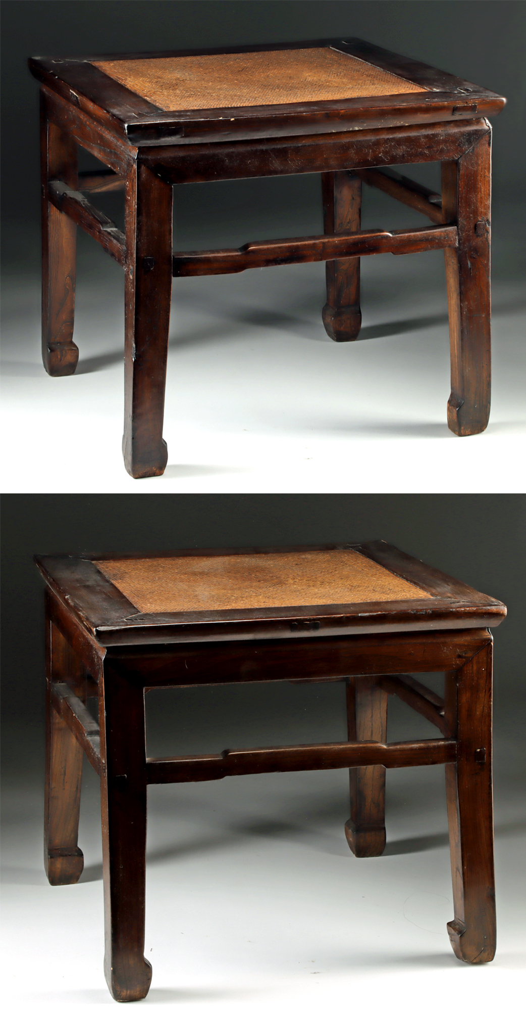 East Asia, China, Qing Dynasty, ca. 19th to early 20th century CE. A fine matching pair of wooden stools, known as fang deng, which can also serve as side tables. Likely carved from elm or huanghuali (rosewood), each features a woven bamboo cane inset top framed within a mortise-and-tenon constructed seat rail. Each stool stands on square-section legs joined by humpback stretchers and ending in hoof feet. The wood displays a warm brown patina with attractive grain movement and natural luster. Size: 21″ L x 21″ W x 19.5″ H (53.3 cm x 53.3 cm x 49.5 cm)