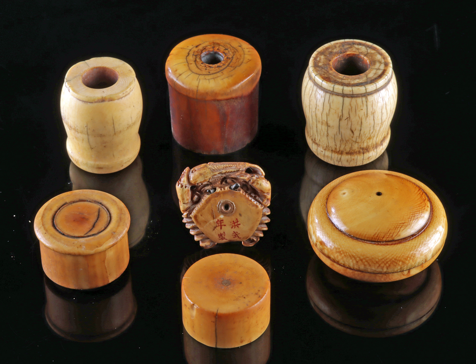 A group of eight elephant ivory smoking pipe fittings, including bowls, endcaps, and mouthpieces, showing a range of turned and carved forms associated with traditional pipe construction. Among them is a particularly notable bowl carved as a finely detailed and naturalistic crab grasping a fish, with red-ink characters, and a brass collar on the base. The mouthpieces are all centrally bored for airflow, while some endcaps are also pierced, reflecting the fact that these caps did not always function to seal the pipe completely due to the common use of bamboo, that naturally forms an internal partitions that seal the stem end. Size of largest: 2″ Diameter x 1″ W (5.1 cm x 2.5 cm)