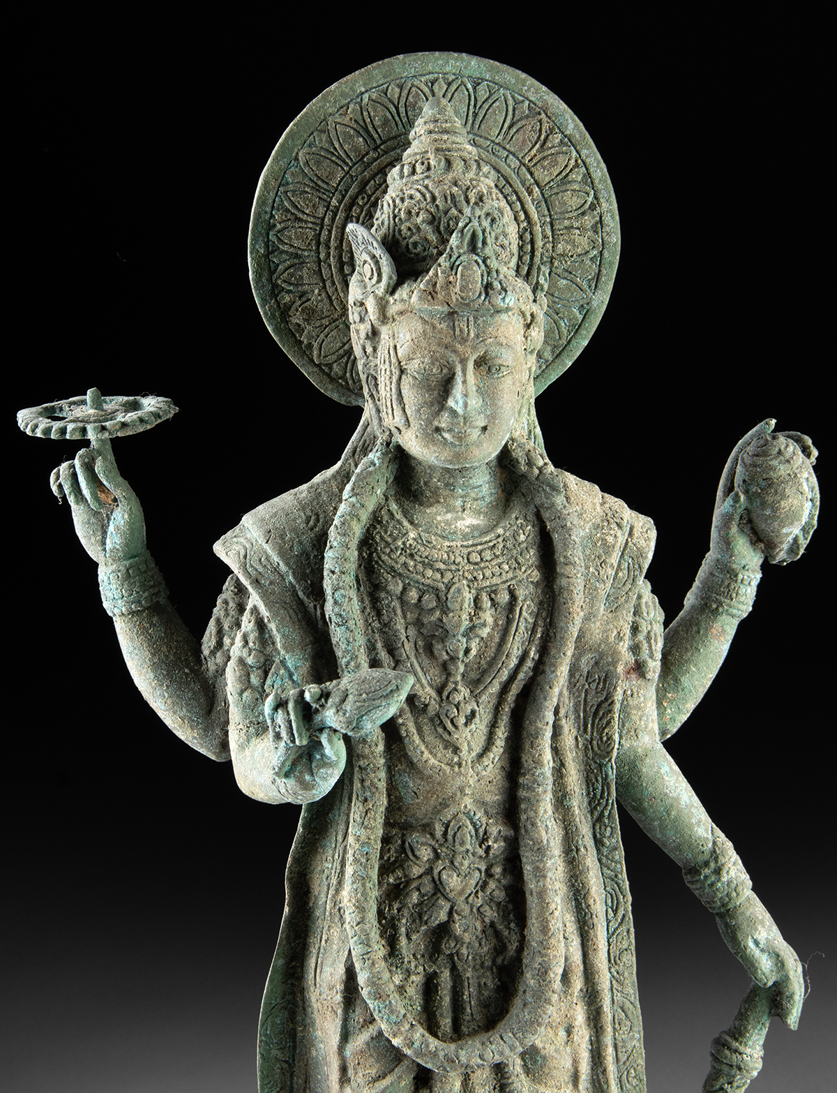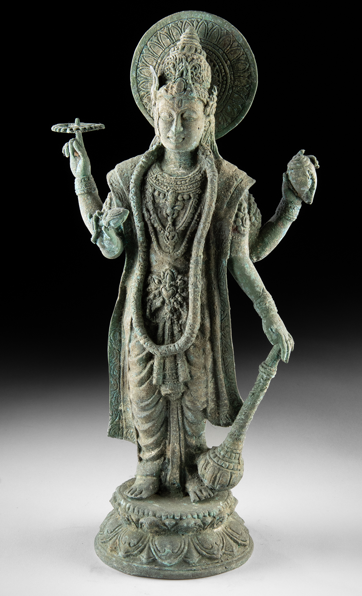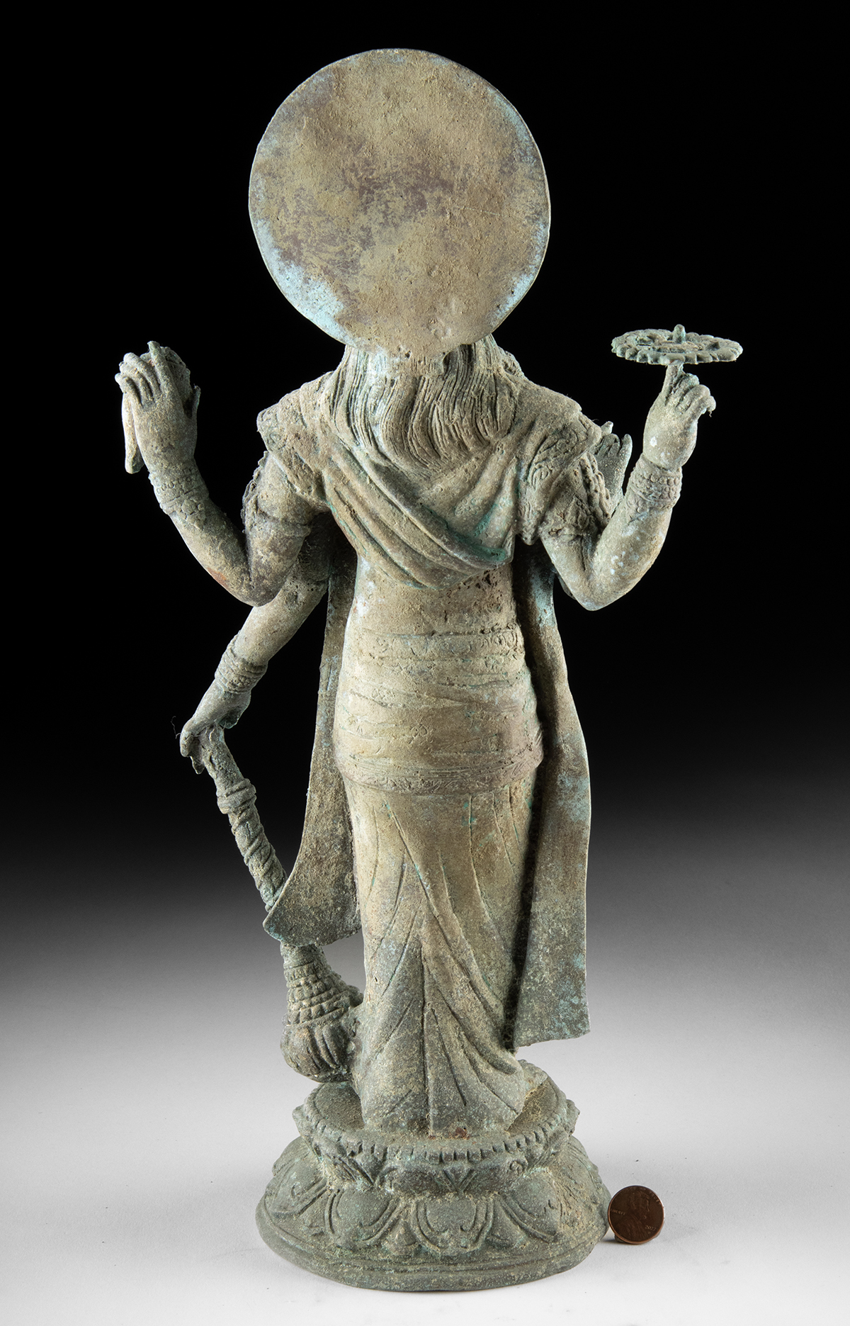Southeast Asia, Indonesia, ca. mid-20th century CE. This brass standing Vishnu figure would add a serene, devotional accent to a garden, patio, or entryway, with a soft verdigris tone that blends nicely into outdoor settings. The four-armed Majapahit style deity stands on a lotus base, holding traditional attributes and framed by a circular halo that gives the piece a clear silhouette from a distance. Size: 7.5″ W x 15.5″ H (19 cm x 39.4 cm)
