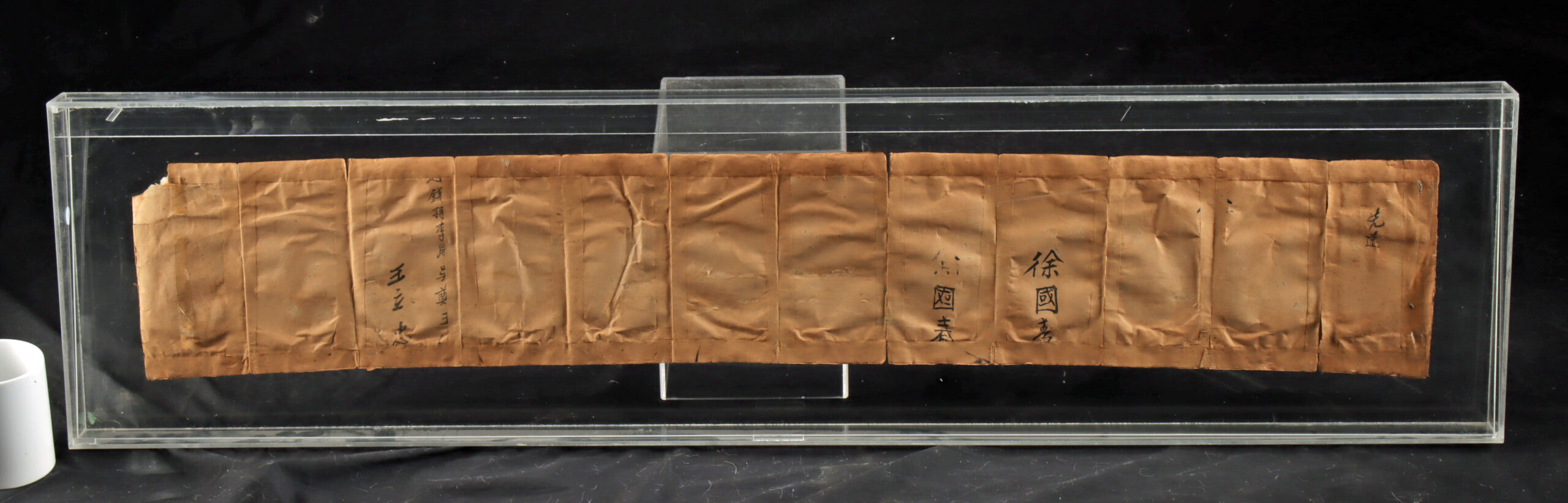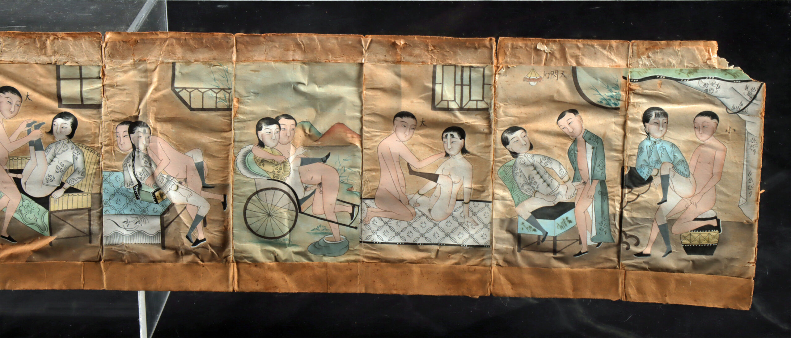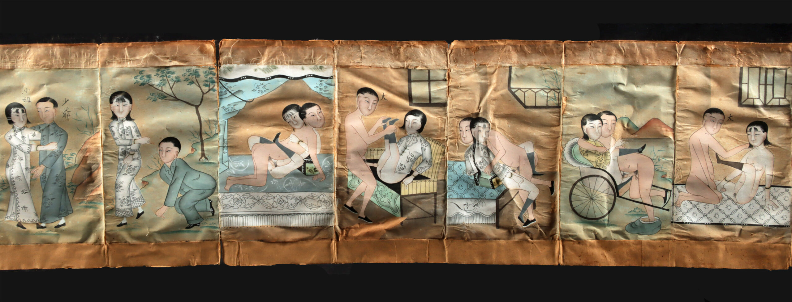 East Asia, China, Republic era, ca. early to mid-20th century CE. Painted erotic scenes on twelve concertina-style folding paper panels form a continuous sequence of intimate vignettes, executed in opaque watercolor and ink with linework and soft, muted washes. Chinese character captions appear on most panels, with further inscriptions on the verso that add narrative or playful commentary. Some men are depicted in Western-style suits and one in a gray military “Mao suit.” Mounted in a clear acrylic case for display and protection. Size of paper: 41.5″ L x 7″ W (105.4 cm x 17.8 cm); acrylic case: 46.5″ L x 11.5″ W x 2″ H (118.1 cm x 29.2 cm x 5.1 cm)