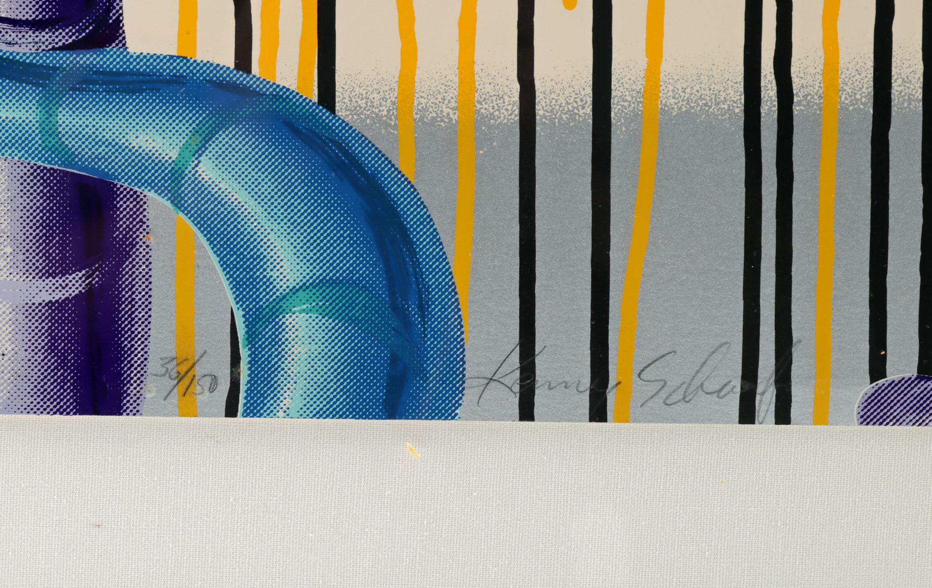 Condition: Water stains and discoloration. Creases and small tears, with loss to the upper corner on the end panel. Paintings are vibrant and graphic. Mounted to an acrylic panel and displayed in a modern acrylic case.