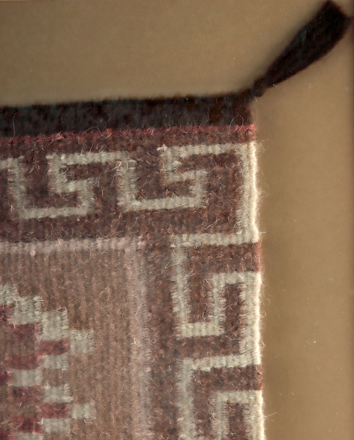 Native American, Southwestern United States, Navajo (Dine) ca. mid-20th century CE. A Navajo wool sampler weaving with a central stepped geometric motif framed by a bold border with repeating angular patterns. The composition features earthy tones of dark brown, cream, gray, and muted pink. Mounted in a wood frame under glass and ready to display. Size of textile: 19″ L x 13.5″ W (48.3 cm x 34.3 cm); frame: 27.5″ L x 22″ W (69.8 cm x 55.9 cm)