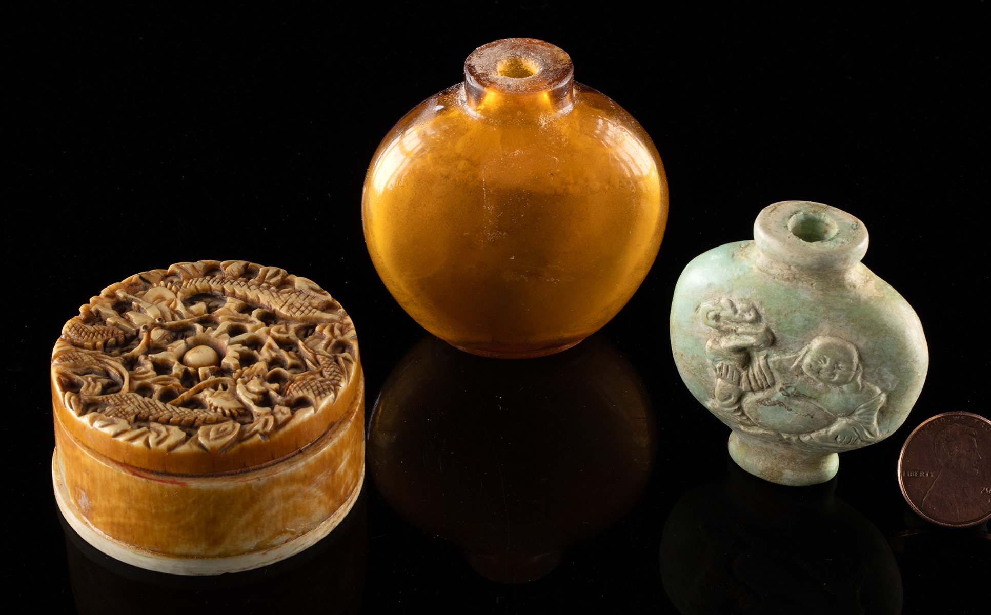 East Asia, China, Qing Dynasty, ca. 19th to early 20th century CE. A group of three small containers comprising two snuff bottles and a carved ivory box. One is a translucent yellow glass bottle of rounded form, retaining white cosmetic or lime residue within. Another is a greenish stone snuff bottle decorated in low relief with a Buddha figure. The third is a circular elephant ivory box with a deeply carved lid featuring dragons chasing the “flaming pearl,” and the interior showing traces of red pigment. Size of yellow bottle: 1.8″ W x 2″ H (4.6 cm x 5.1 cm)