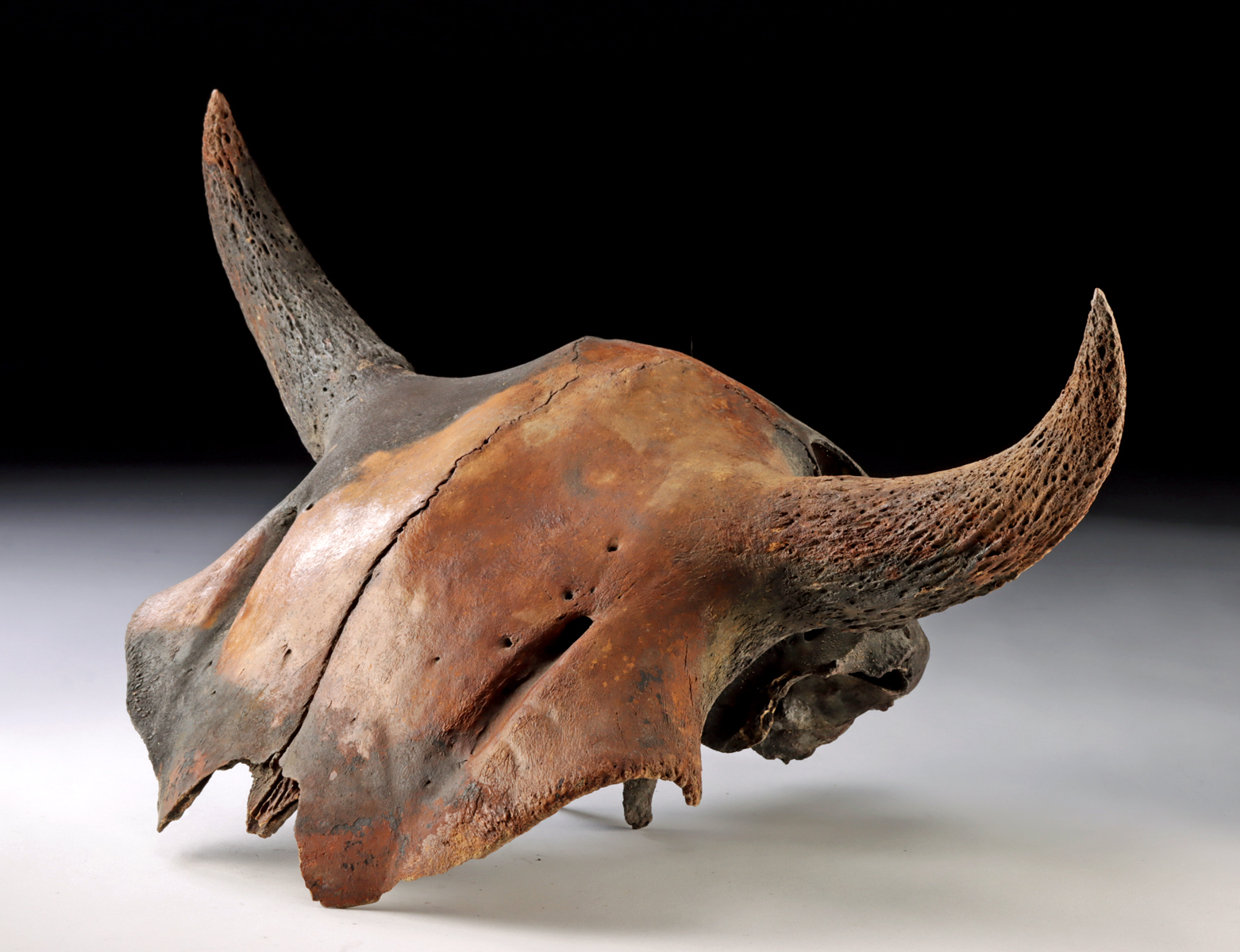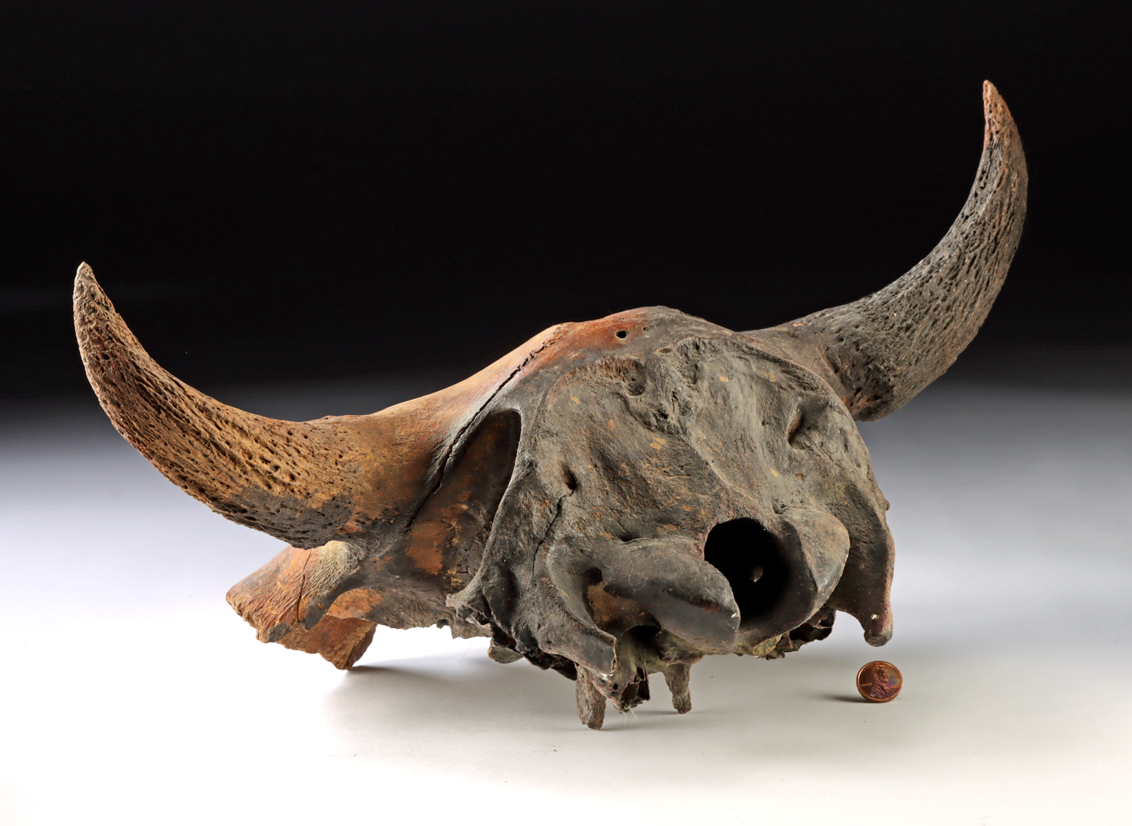 North America, Late Pleistocene, ca. 10,000 years ago. A well-preserved, fossilized skull fragment of a prehistoric juvenile North American bison (Bison antiquus). The bone has darkened over the ages to hues of umber and burnt sienna. The skull retains its iconic horns which project from the sides of the head and clearly identify this animal. The upper part of the wide face also contains part of the prominent eye sockets. The bovine family, which contains Taurids (cattle) and bisonids, diverged from a common ancestor with the water buffalo and African buffalo around 5 to 10 million years ago. The bison at some point migrated from Asia across the land bridge into North America. During the Ice Age, these bison were much larger, with species like Bison latifrons (giant bison) and Bison antiquus evolving to become smaller and smaller as the millennia passed and the climate changed. However, modern bison are still the largest land mammals in North America – bigger than moose, elk, and even grizzly bears! This skull is a wonderful piece of prehistoric history! Size: 10.25″ L x 17.625″ W x 9.75″ H (26 cm x 44.8 cm x 24.8 cm)