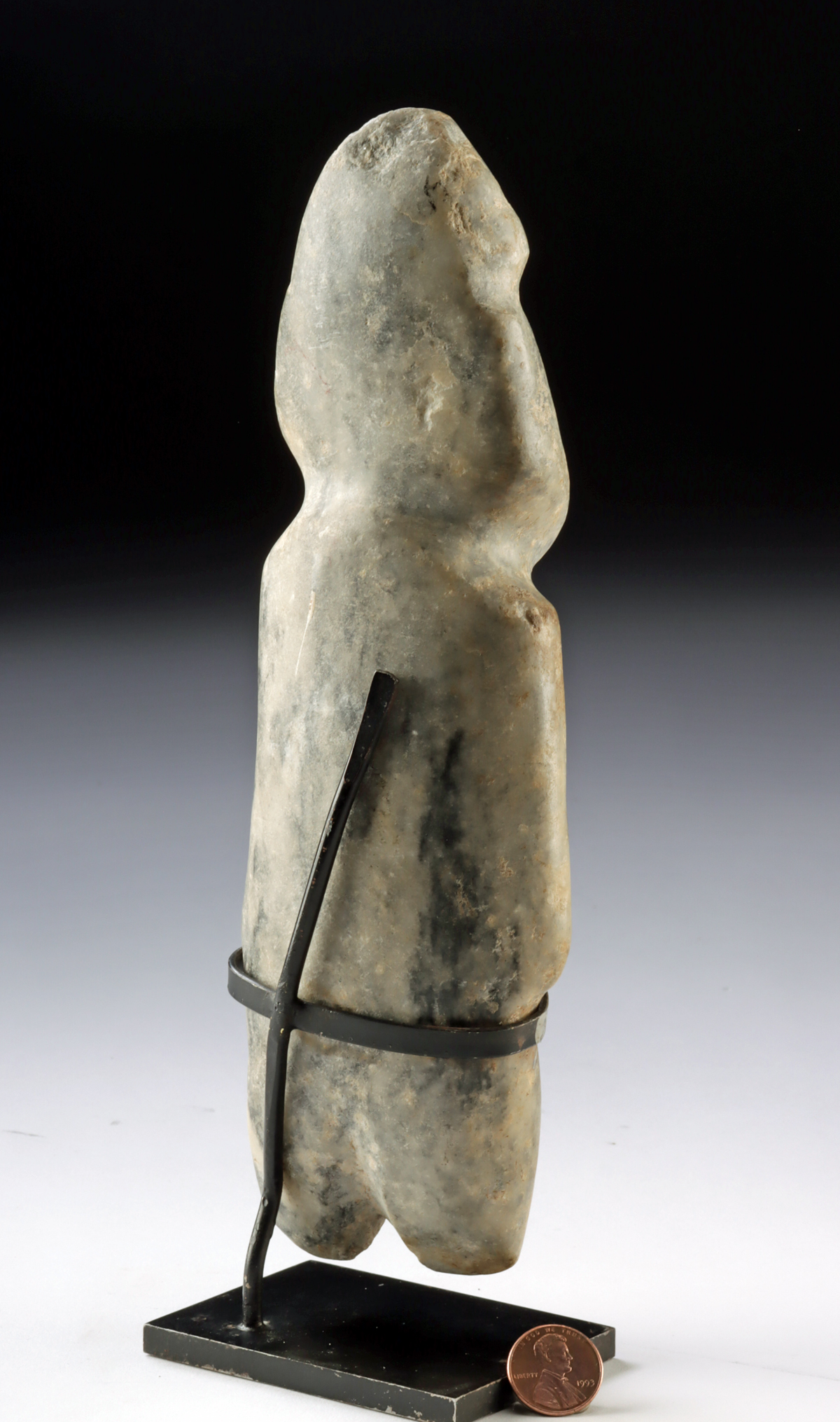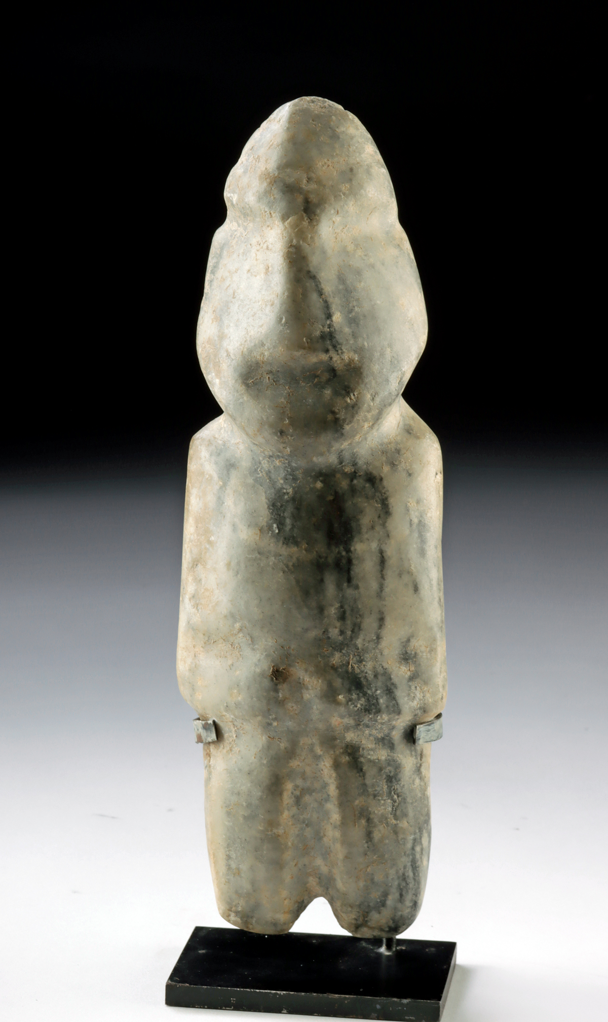 Pre-Columbian, West Mexico, Guerrero, Mezcala culture, ca. 700 to 200 BCE. A strikingly reductive stone figure, its compact silhouette and quiet symmetry embody the austere elegance of Mezcala sculptural tradition. Carved from a dense, pale stone with natural dark veining, the figure presents a highly abstracted human form – the head gently rounded, the torso columnar, and the legs minimally divided, creating a rhythmic, almost architectural presence. The restrained modeling reflects the canonical Mezcala aesthetic, in which anatomical detail yields to geometric clarity. Facial features are only faintly suggested, if at all, lending the figure an enigmatic, timeless expression. The slight articulation at the shoulders and the subtle tapering of the body suggest a standing posture, while the bifurcated lower section evokes legs or a symbolic grounding element. Size: 3.3″ W x 9.3″ H (8.4 cm x 23.6 cm); 10.1″ H (25.7 cm) on included custom stand.