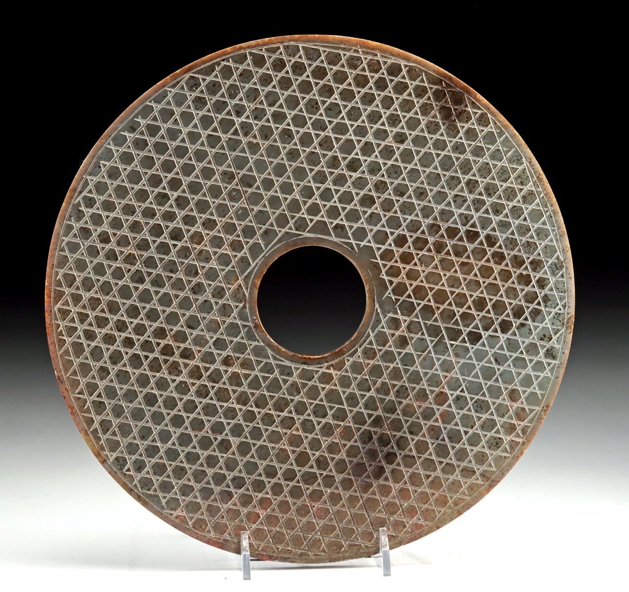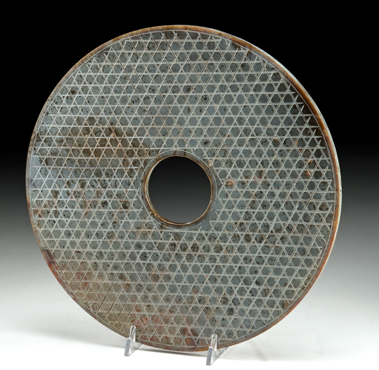 East Asia, China, late Qing dynasty to Republic period, ca. early to mid-20th century CE. A large Chinese archaistic bi disc carved from dense gray stone, modeled after ancient ritual jades associated with antiquity and cosmological symbolism. The disc is precisely drilled with a central aperture and finished on both faces with an evenly spaced cross-hatched lattice pattern, recalling Neolithic and Han dynasty prototypes while clearly reflecting later revivalist taste. Archaistic stone carvings of this type were produced during the late Qing and early Republic periods as scholarly objects, display pieces, or architectural and interior elements, appealing to antiquarian interests and reverence for China’s early ritual forms. The disciplined geometry of the incised pattern contrasts with the muted gray stone and areas of surface wear, giving the piece a restrained and intentional presence. Size: 9.9″ Diameter (25.1 cm)