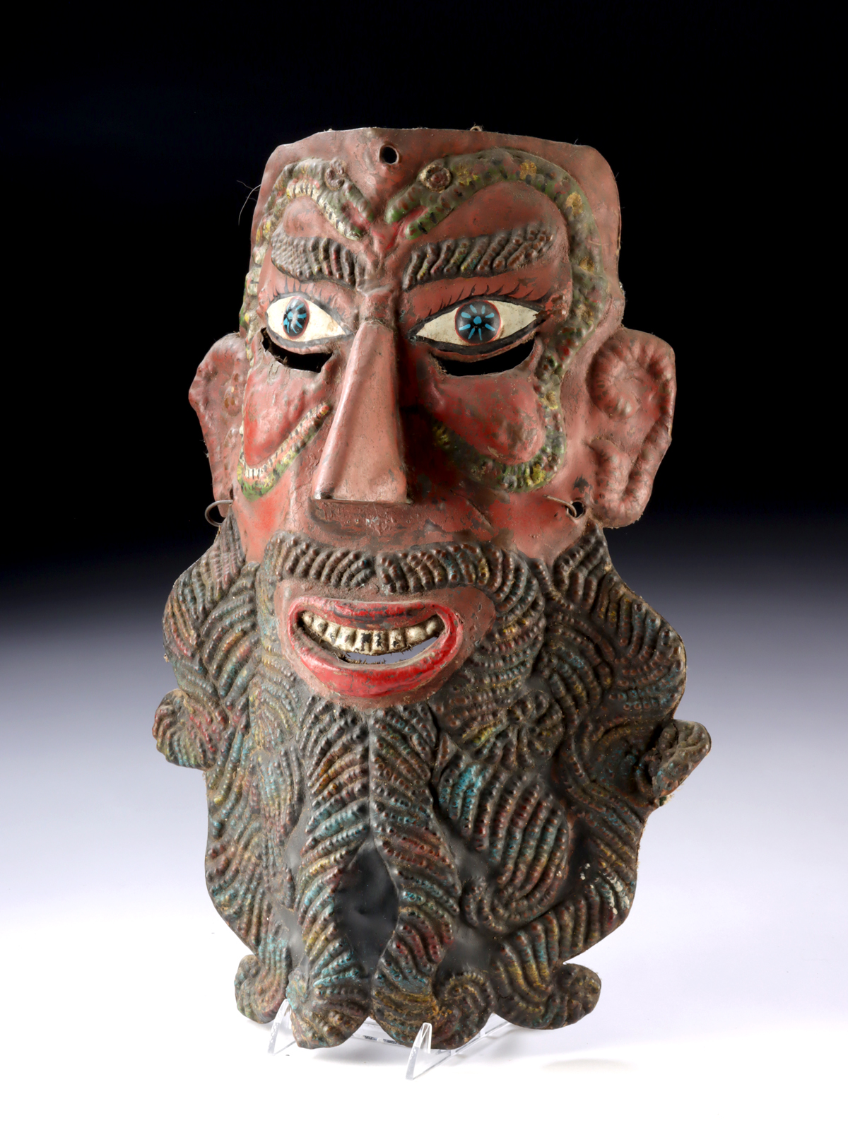 Latin America, Mexico, Guerrero, ca. 20th century CE. A striking brass mask with a commanding bearded visage, its piercing blue eyes and sinuous serpent motifs create an arresting fusion of drama and symbolism, rooted not in antiquity but in the layered cultural exchanges of modern Mexico. The face is distinctly European in physiognomy, with a pronounced nose, arched brows, and full curling beard rendered in dense, rhythmic strands that cascade across the lower register like stylized foliage or waves. Encircling the eyes are coiling serpents, their bodies articulated in raised relief and painted in contrasting tones, introducing a visual tension between human identity and mythic embellishment. The eyes themselves, inset and vividly colored, heighten the mask’s theatrical presence, suggesting animation and heightened awareness. Traces of polychromy across the surface – red, green, and darkened patina – accentuate the sculptural modeling and attest to both aesthetic intent and age-related wear. Size: 10.1″ W x 14.5″ H (25.7 cm x 36.8 cm)