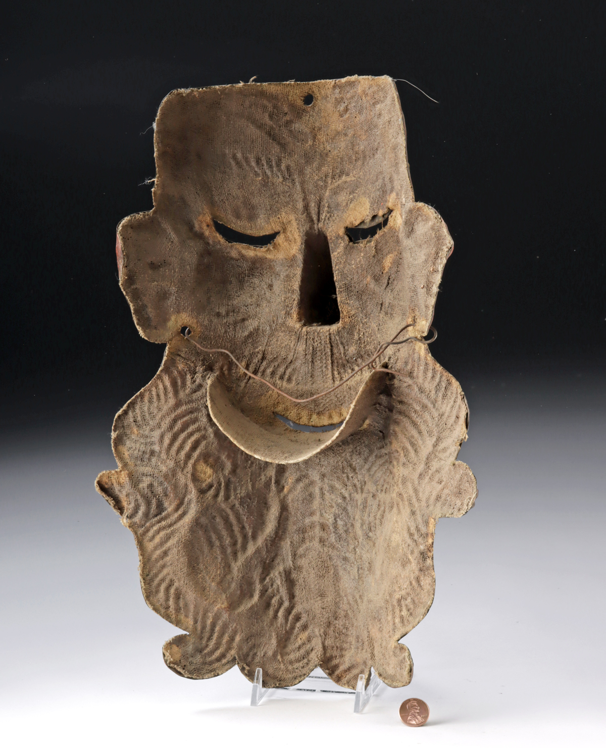 The verso is lined with canvas, secured to the interior to provide structural support and comfort in wear, an addition consistent with masks intended for handling, display, or performance contexts.