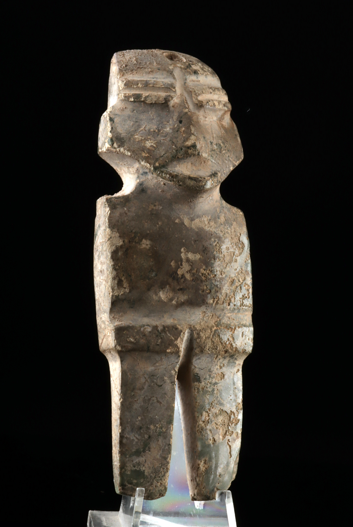 Pre-Columbian, Mesoamerica, Chontal culture, Late Preclassic, ca. 300 to 100 BCE. A finely carved Chontal stone celt figure of stylized anthropomorphic form, with a broad flattened head, incised facial features, and bifurcated legs, likely serving as both a symbolic effigy and a suspended ritual or status object. Size: 1.4″ W x 4″ H (3.6 cm x 10.2 cm)