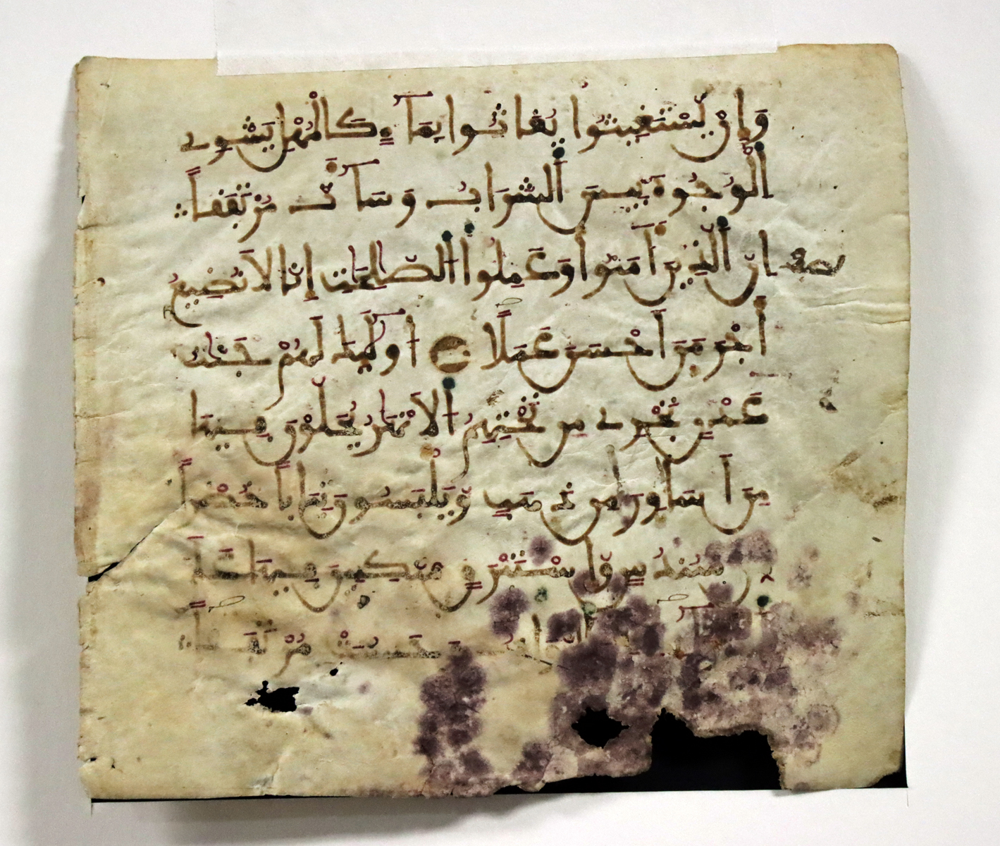 North Africa or the western Islamic world, Maghrebi cultural sphere, ca. 18th to 19th century CE. A single Qur’an manuscript leaf rendered on parchment in Maghrebi script, the dominant Arabic script historically used from Mali to al-Andalus. The text is written in a faded black-brown ink and is punctuated with red and green diacritical marks that guide pronunciation and recitation. These chromatic additions reflect the practice of tajwid, the Islamic art of reciting the Qur’an correctly, a discipline whose name translates literally as “beautification.” The measured spacing, rounded letterforms, and restrained palette emphasize both clarity and devotional intent. The passage was identified as Surah al-Kahf, verse 28, concerning divine counsel to the Prophet on patience, though this attribution remains unverified. Size of parchment: 7″ L x 6.3″ W (17.8 cm x 16 cm); matting: 10.8″ L x 9.75″ W (27.4 cm x 24.8 cm)