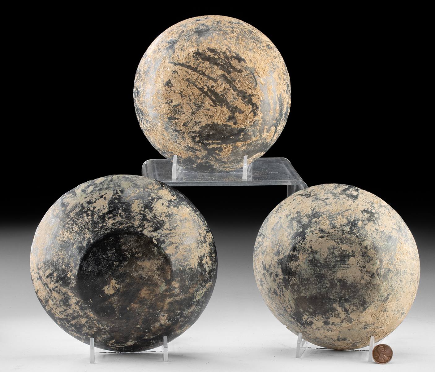 Near East, Persian, Ghaznavid period, ca. 977 to 1186 CE. A handsome trio of medieval bronze bowls, this group offers the quiet drama of timeworn metalwork, their surfaces mottled into a painterly patina by centuries of use and burial. Each bowl is formed with a broad, shallow profile and gently rising walls, creating an elegant utilitarian silhouette typical of Ghaznavid domestic wares. The interiors and exteriors display rich tonal variation, ranging from smoky charcoal to warm earthen browns, with areas of mineral accretion that lend the vessels an almost landscape-like texture. Together, the set presents a compelling study in medieval Persian bronzework – modest in form, yet deeply atmospheric, and exceptionally displayable as a group. Size of largest: 6.7″ Diameter x 2″ H (17 cm x 5.1 cm)