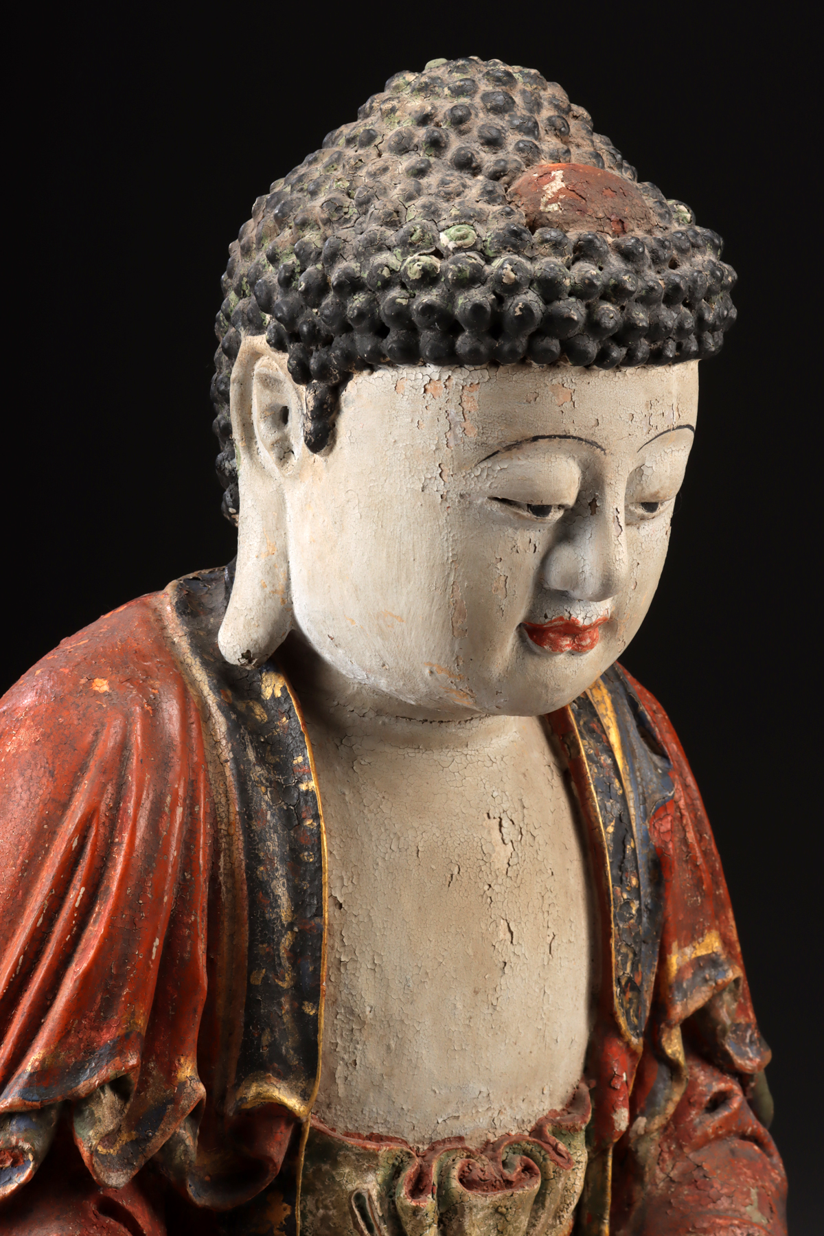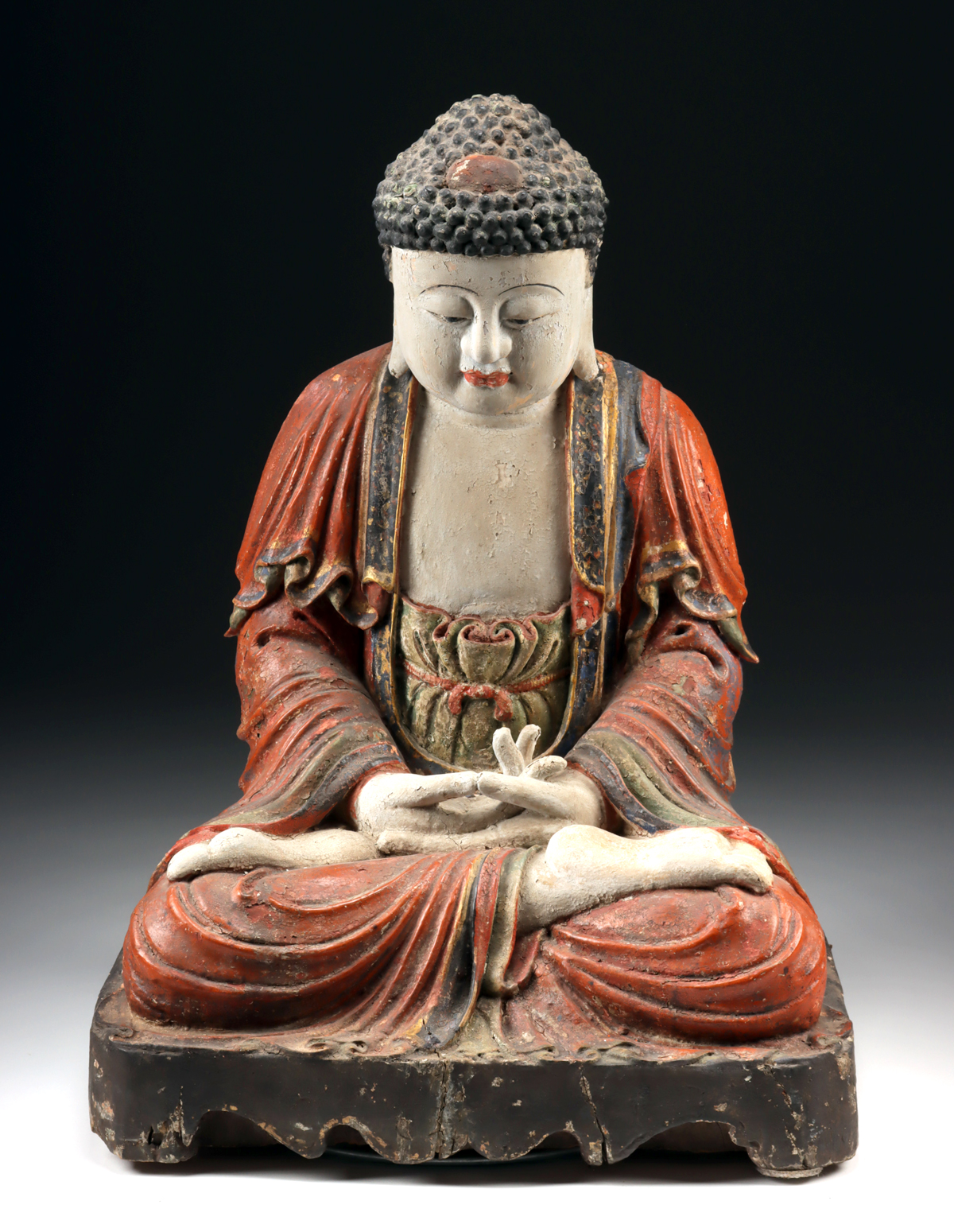 East Asia, China, Ming Dynasty, ca. 16th century CE. A magnificent hand-carved wooden figure of Buddha Sakyamuni, seated in deep meditation atop a narrow, unadorned throne. His legs are crossed in padmasana (lotus position) with both soles exposed, while his hands rest gently in his lap in dhyana mudra, the traditional gesture of meditation. His thumbs touch to form a triangle known as the triratna, symbolizing the triple gems of Buddhism – the Buddha, the Dharma (the teachings), and the Sangha (the monastic community). His serene visage is marked by gently arched brows, downward-gazing, lotus-shaped eyes, and full lips turned slightly downward in contemplation. Black-painted, snail-shell curls form his hair, capped by a pronounced ushnisha at the crown of his head, at the center of which sits a red painted jewel (nikkeishu) radiating enlightenment and spiritual wisdom. Size: 25.4″ L x 18.5″ W x 13.5″ H (64.5 cm x 47 cm x 34.3 cm)